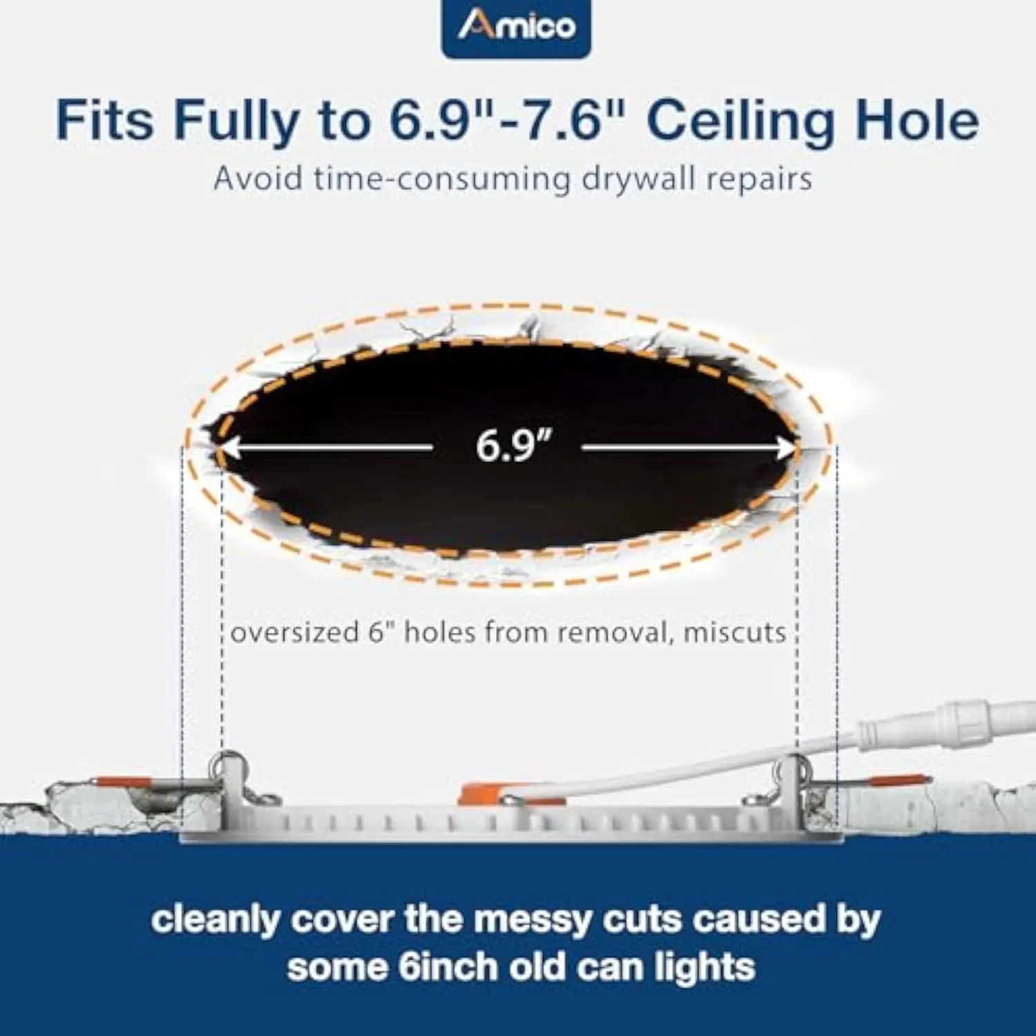 Larger light panel: the panel diameter matches well to some oversized conventional 6 inch recessed cans’ hole. It can also cover the staining caused by some old 6in can light. Choosing it means that you don’t have to do drywall repair or spend extra money on goof rings to fully cover the hole left by old 6 inch can light. Meantime, the 7 inch light output is a bitmore, which is great for bigger room