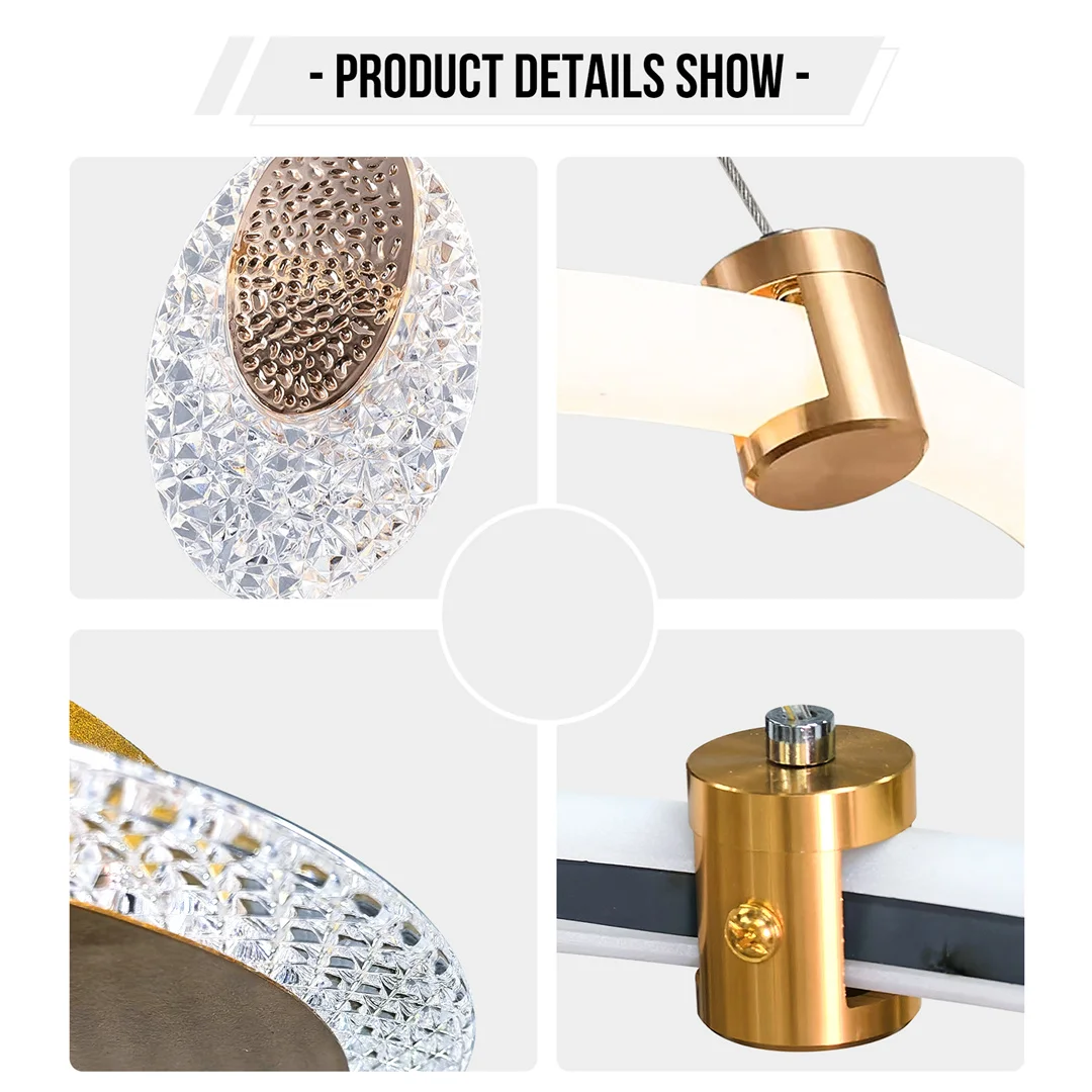 【Versatile Lighting Fixture】Whether you chooseit to illuminate your dining room for meals, add a warm and inviting ambiance tothe living area, or enhance the grandeur of your entrywayfoyer, this chandelier fixture is sure to elevate the overall aesthetic and ambiance of the spaces, the combination of circular led rings, clear acrylic accents and gold finish create a balanced and visually appealing contrast, ensuring this piece stands out as a statement piece and drawing eyes