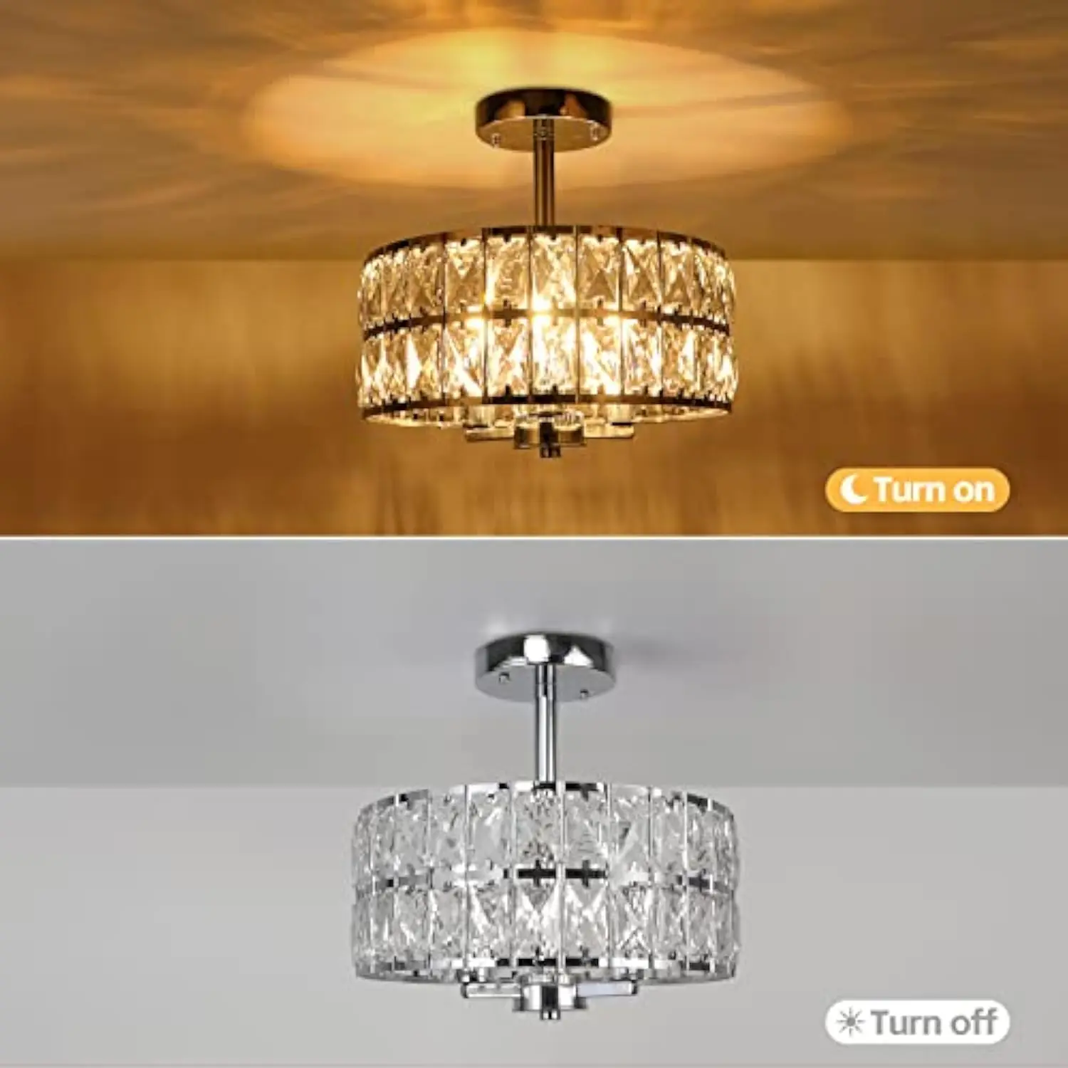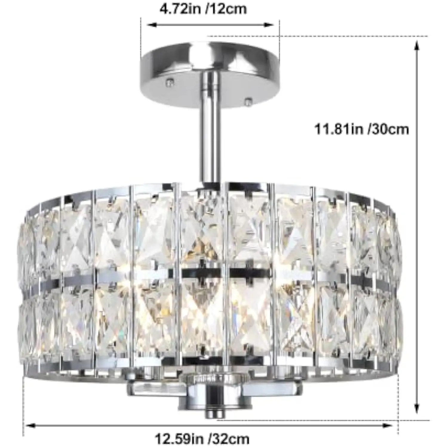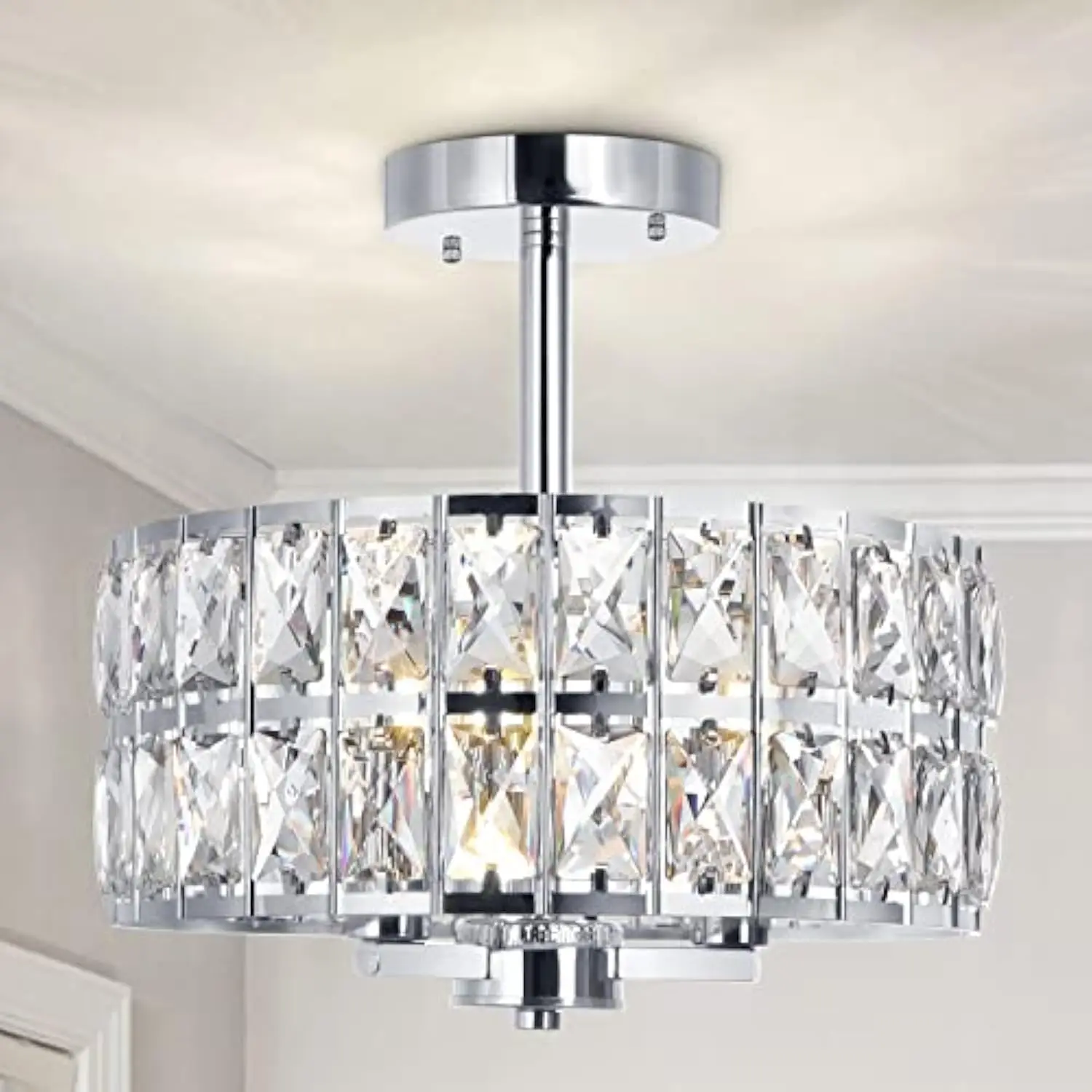 Modern design: this 3-light semi flush mount ceiling light fixture is made of metal drum shade in chrome finish and crystals for a modern and luxurious look The clear crystals gleam in the light reflections and cast a beautiful shadow on the ceiling, adding elegance to any room.