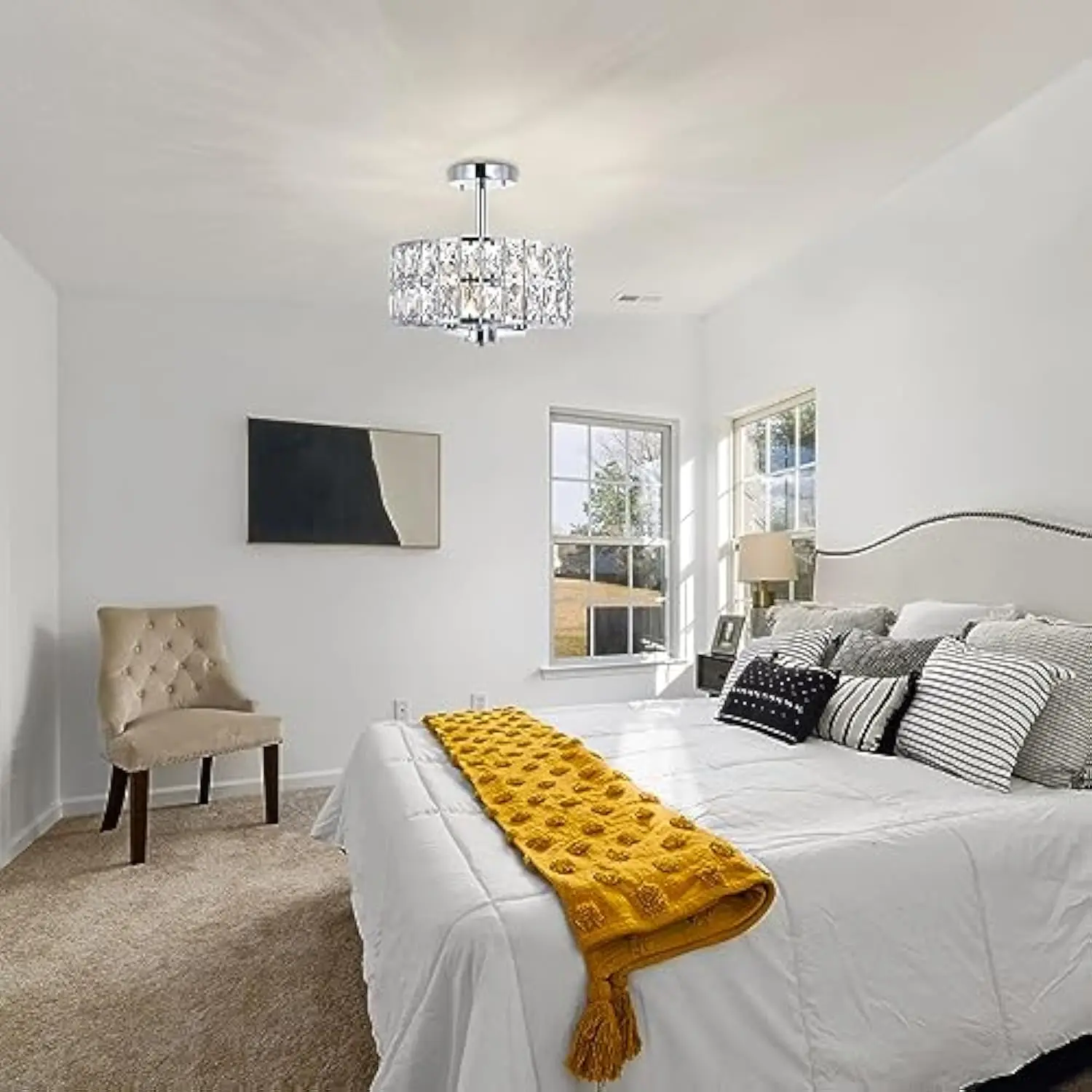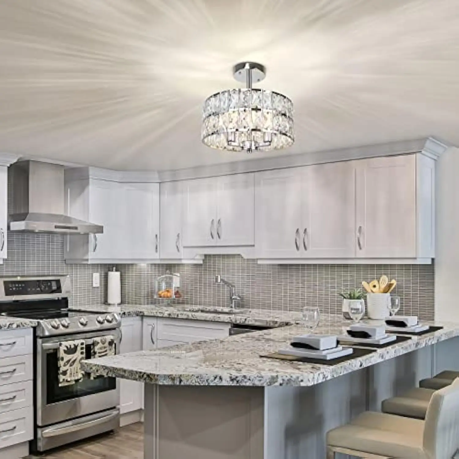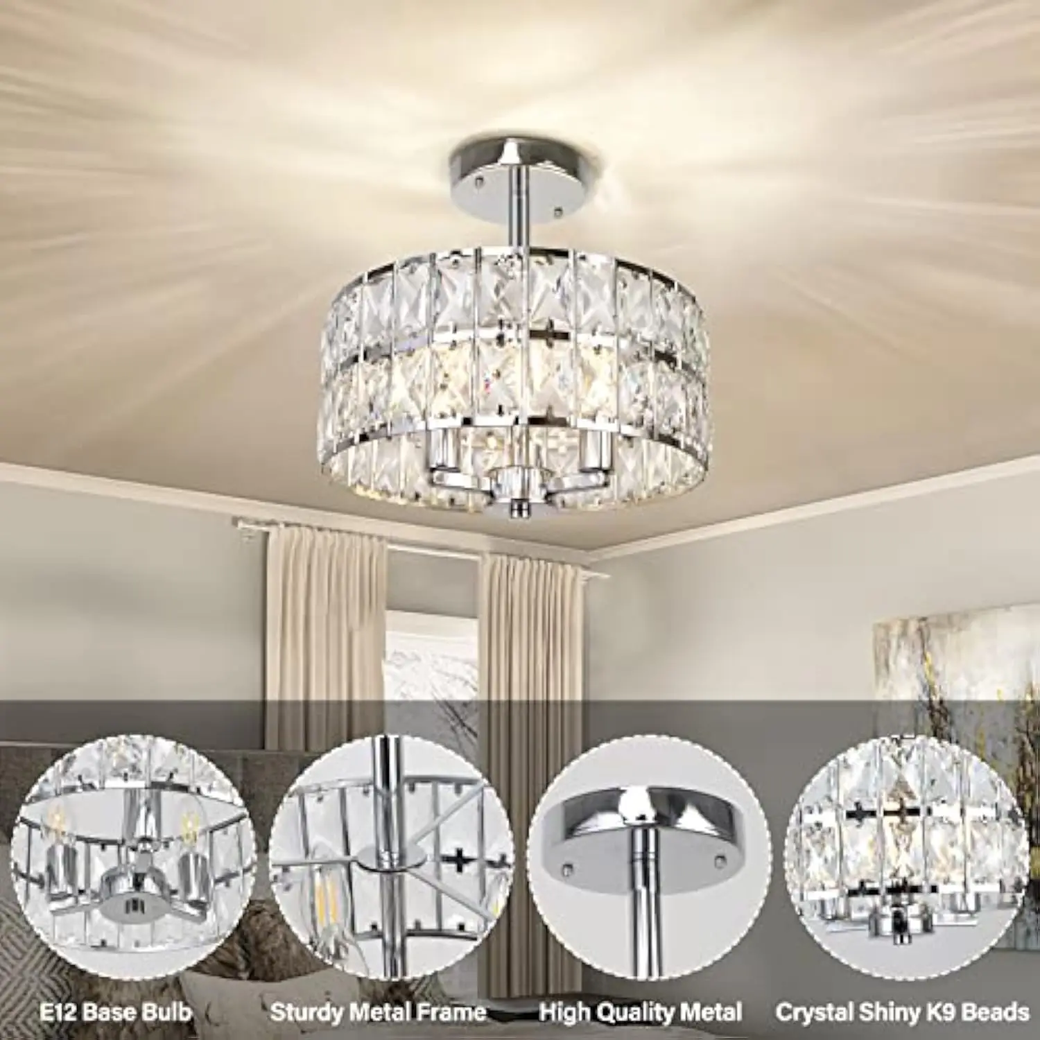 Modern design: this 3-light semi flush mount ceiling light fixture is made of metal drum shade in chrome finish and crystals for a modern and luxurious look The clear crystals gleam in the light reflections and cast a beautiful shadow on the ceiling, adding elegance to any room.