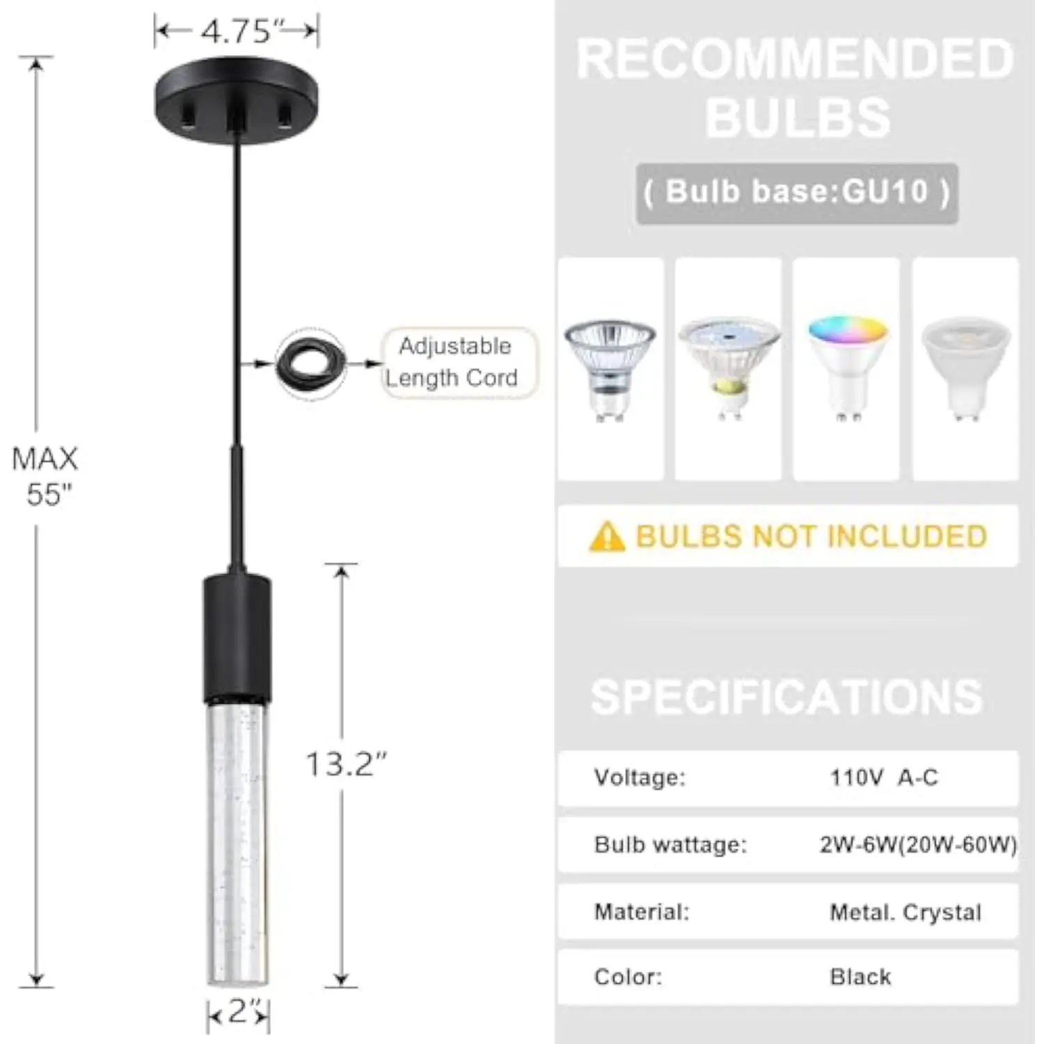 1.UL Certification Pendant light size:H55″ *W2″.Crystal shade size:L9.45″*W2″ Canopy size:L4.75″*W0.79″ 2.Recommended light bulb: as shown on the left:GU10 Bulb.Allowing you to customize your lighting preferences with fully dimmable options (dimmer and adjustable bulbs sold separately). 3.Applicable environment:Entryway, Kitchen, Bathroom, Bedroom, Living Room, Library, Hallway, Dining Room, Over Sink, Bedside 4.EASY INSTALLATION: Hard wired.Includes all mounting hardware for quick and easy installation.Comes with 50″ adjustable cord ,these kitchen hanging light fixtures can be applied to the sloped ceiling for your space needs. 5.You will have a very friendly Purchase experience:If you have any questions, Please contact us through the Amazon message box and we will solve it for you as soon as possible.Product Dimensions : 4.75 x 4.75 x 55 inches; 12.76 Pounds