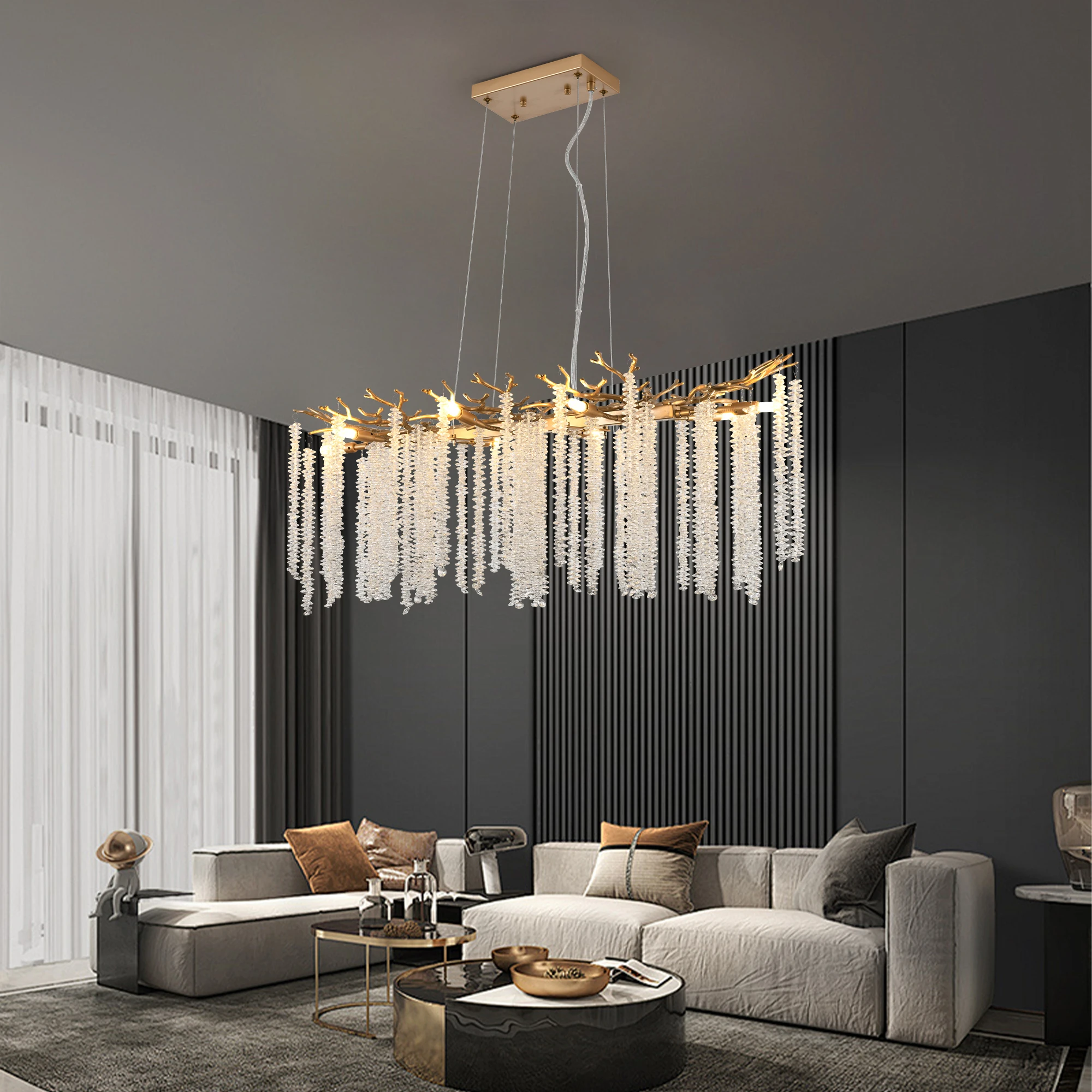 Unique waterfall crystal design:The chandelier consists of multiple suspended crystal strings, creating an elegant waterfall effect.When light hits the crystals, it creates a beautiful refraction effect, adds a sense of luxury to the space.