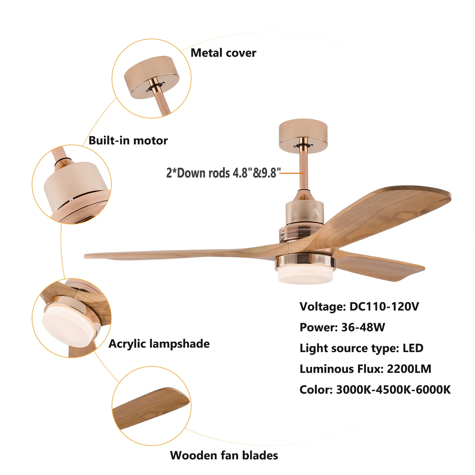 ✔ Ceiling Fan with Light: 2200 Lumens, 36-48W, Three Color Temperature Choices, Warm (3000K) – Warm White (4500K) – White (6000K). Long-lasting bulbs have a longer lifespan than traditional bulbs.