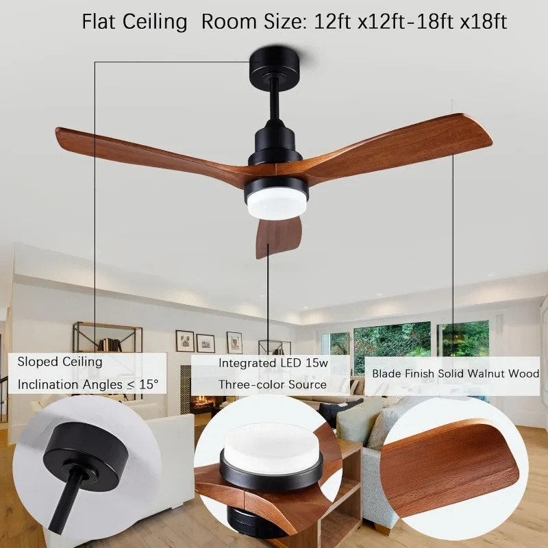 ▲【Solid Wood Ceiling Fan with Lights】:The wood ceiling fan is made of three solid wood blades, black alloy steel for the main body and mahogany color fan blades. Light (LED) kit, adjustable different color temperature, 1500 lumens, 15W. save energy and protect your eyes.