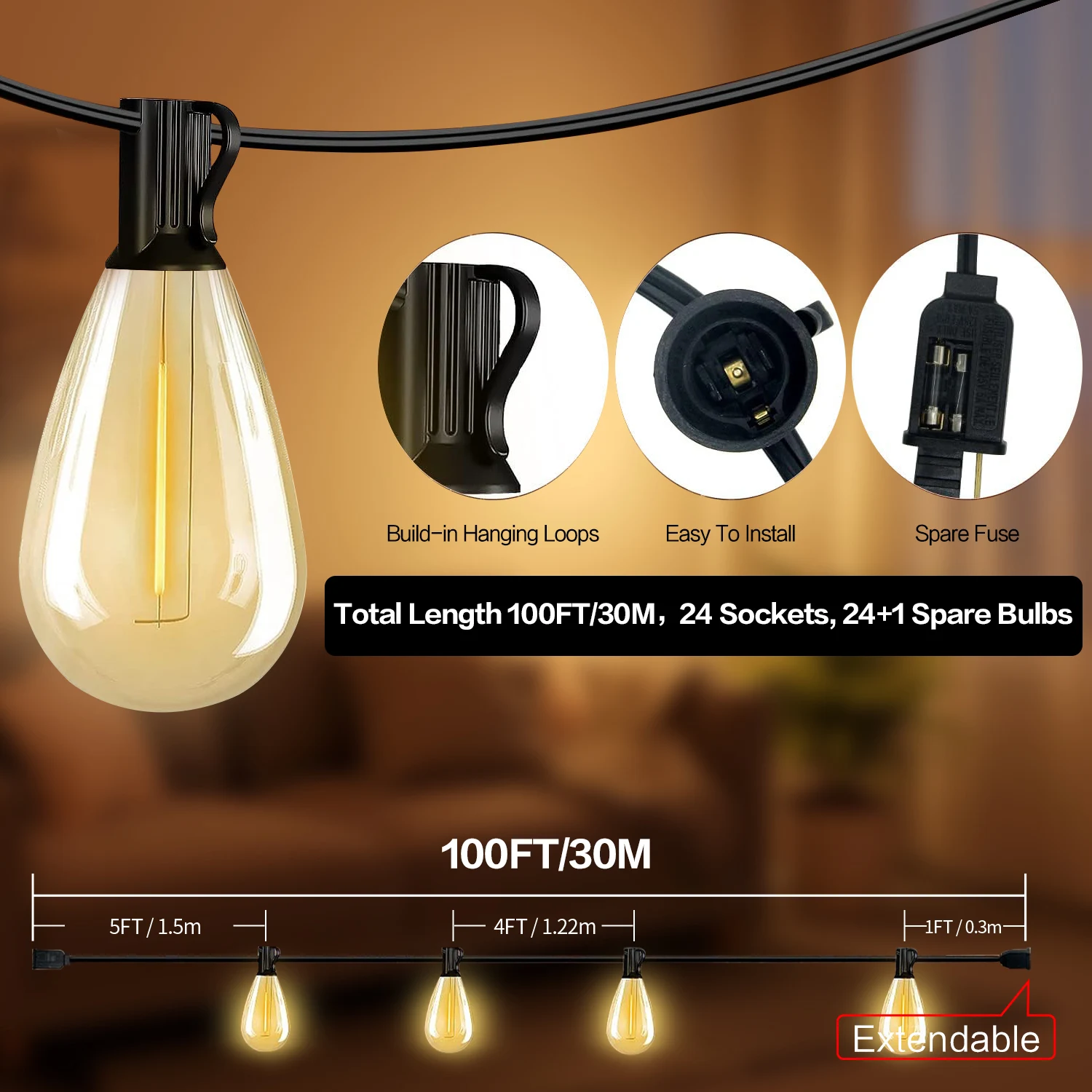 Elegant & Retro: This string lights use S14 vintage Edison bulbs to create a great ambiance on your patio. Install the light over your porch or gazebo to create a retro bistro look and pleasant party ambiance.