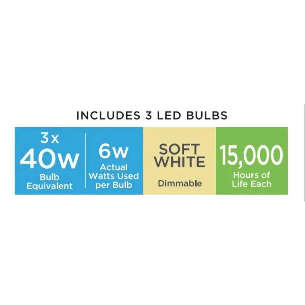 - Clear Light Kit, 3 6W, E26 A15 LED bulbs, 3000K, 90CRI (Included)