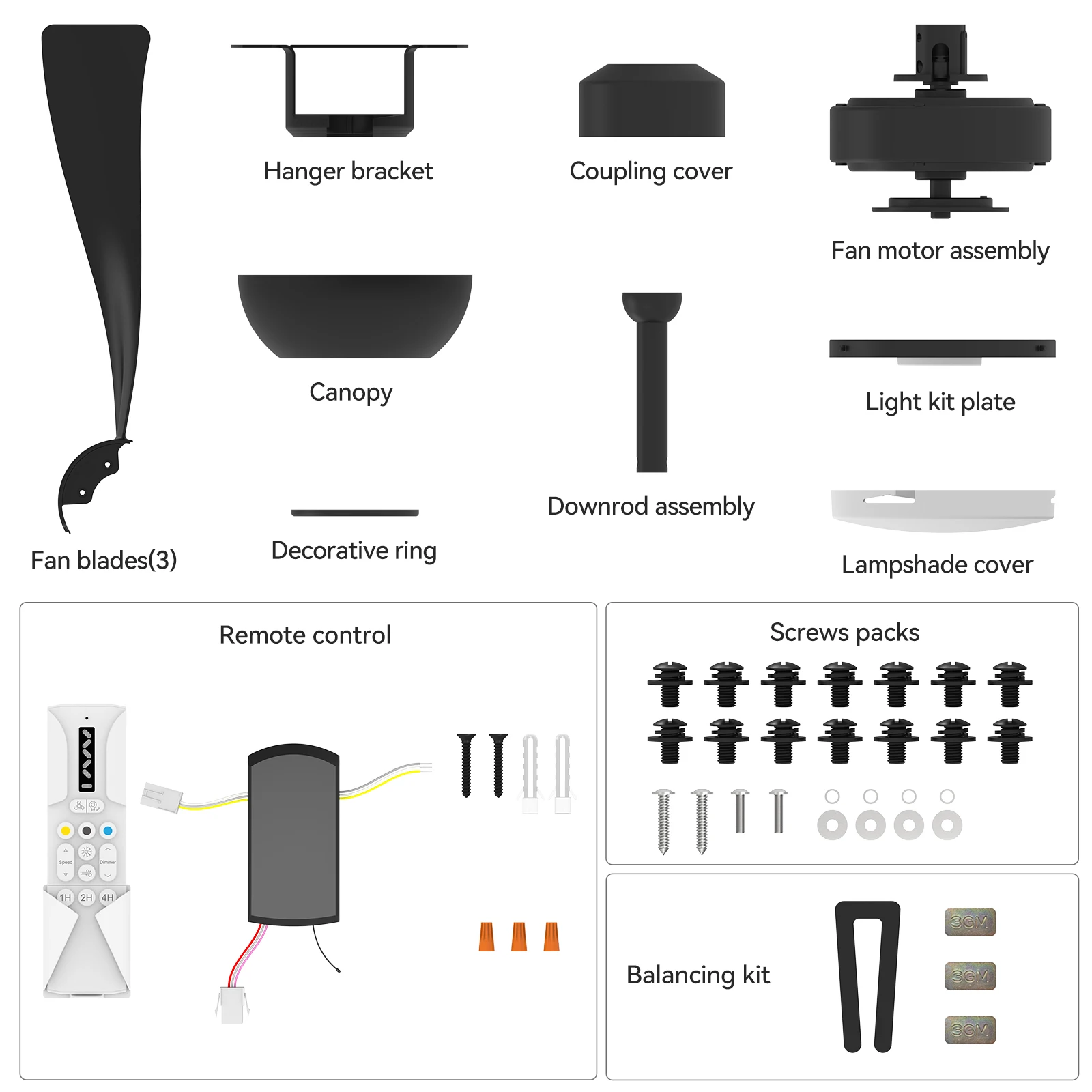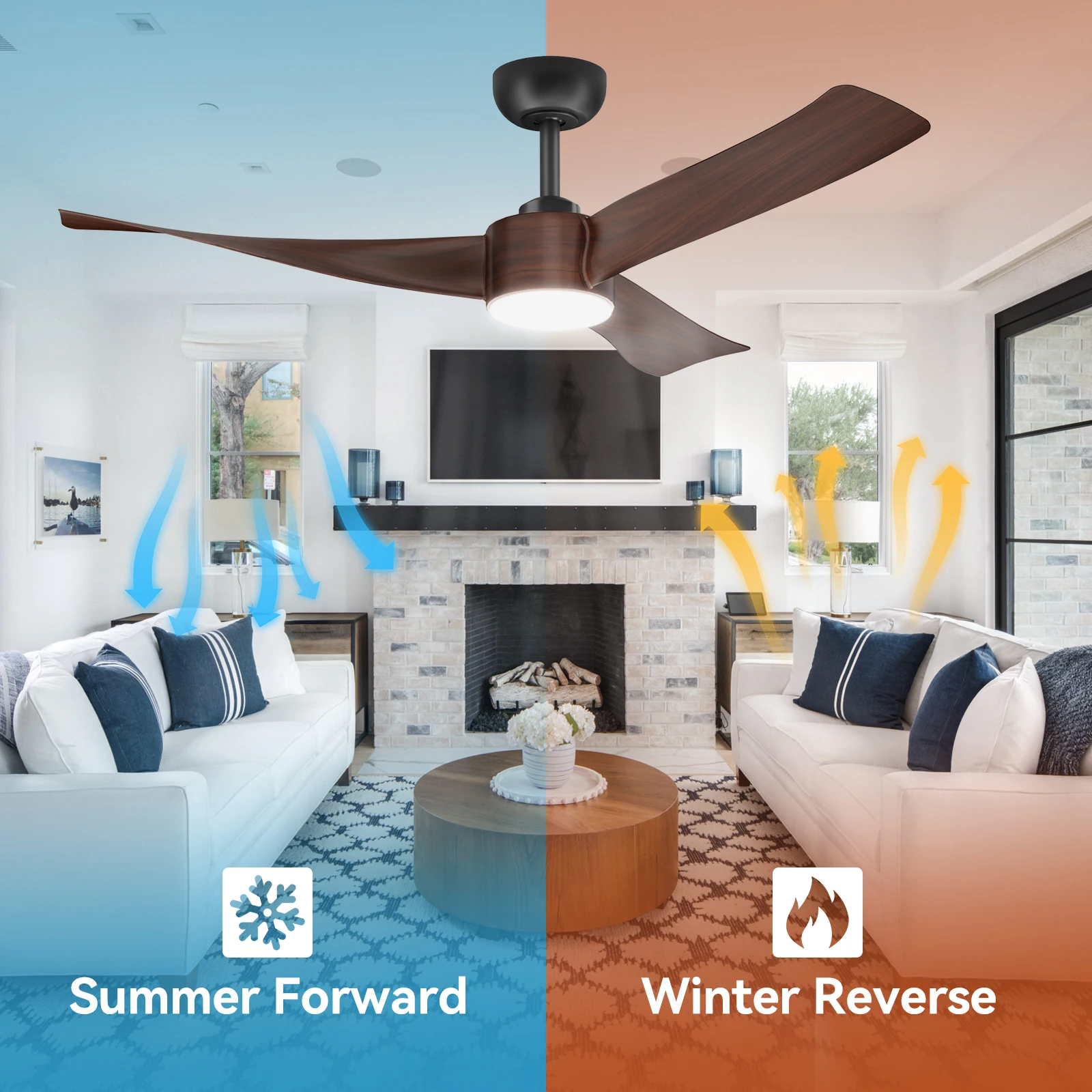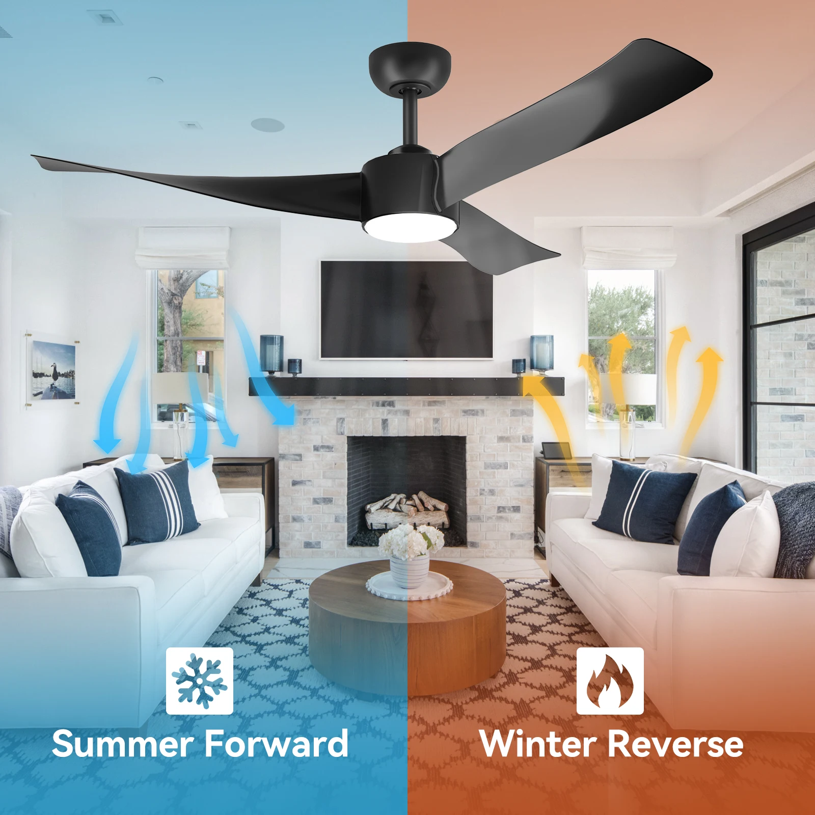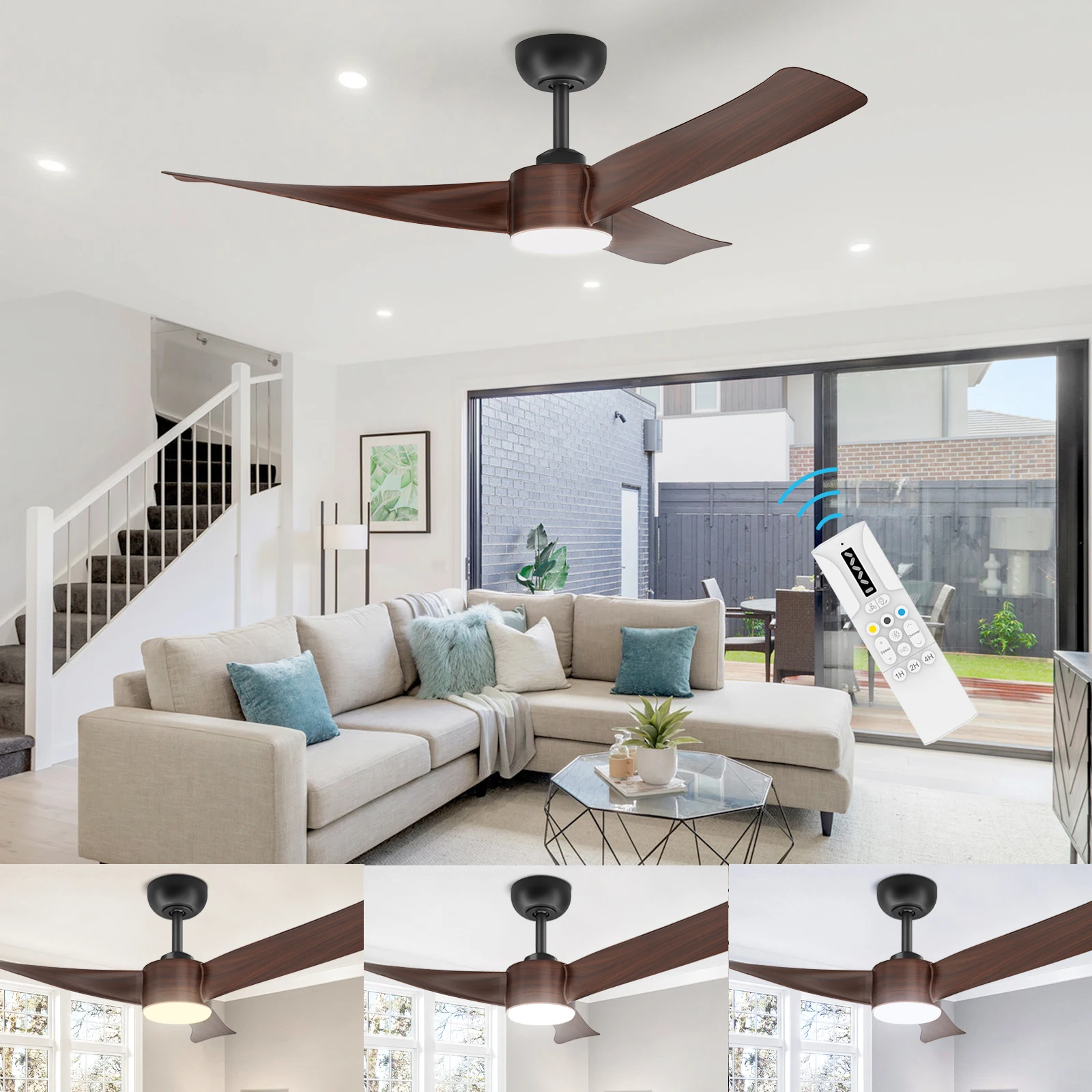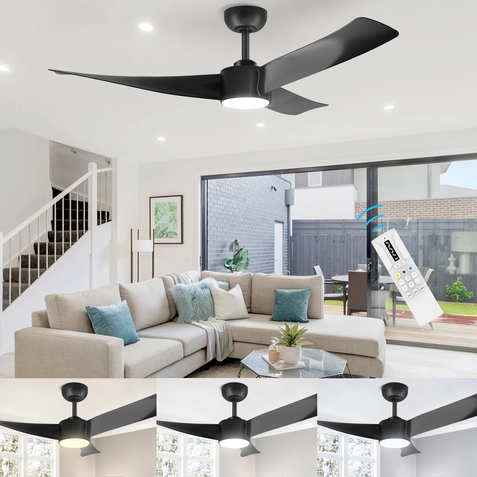 —High-quality modern ceiling fan – this 52 inch (diameter 132 cm) ceiling fan for outdoor use with a 15 cm long rod consists of three black composite blades. This ceiling fan with light is suitable for decorating rooms in classic American and modern style and is suitable for various environments, such as family rooms or offices, including patios, gazebos and other areas that are not directly exposed to the rain.