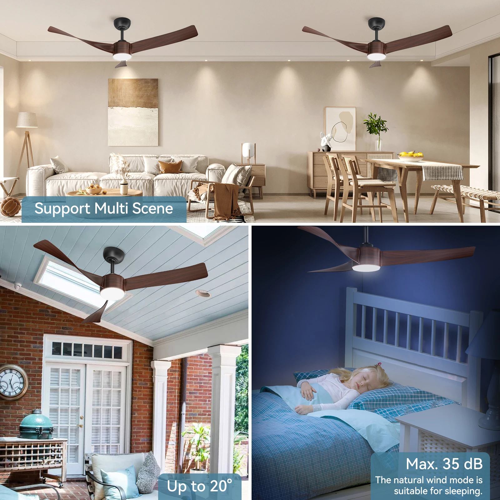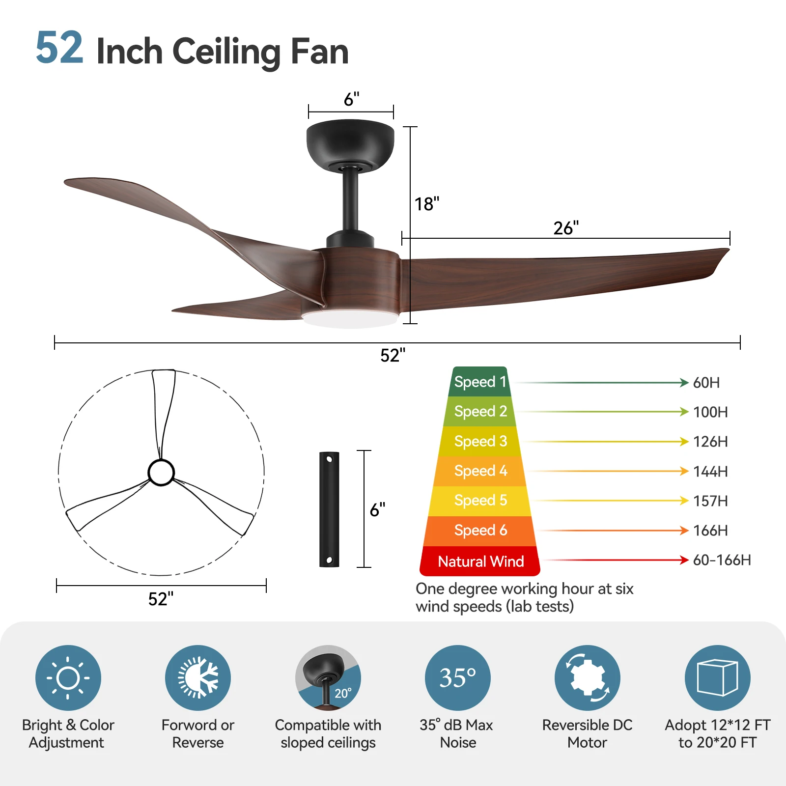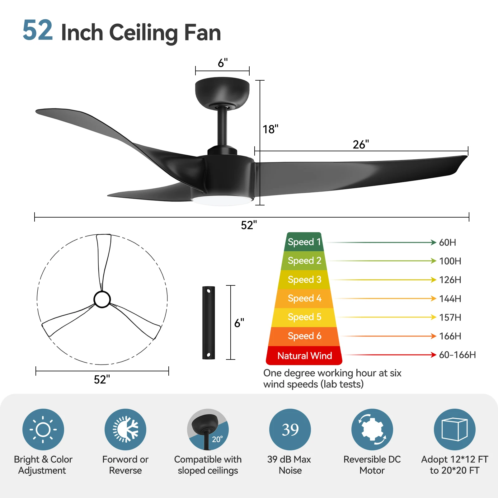 —Quiet and reversible DC motor – the reversible two-direction fan with a powerful motor can provide a wide range of air circulation. Compared to AC motors, DC motors with a noise level of less than 35 dB are quieter and do not disturb sleep or learning.