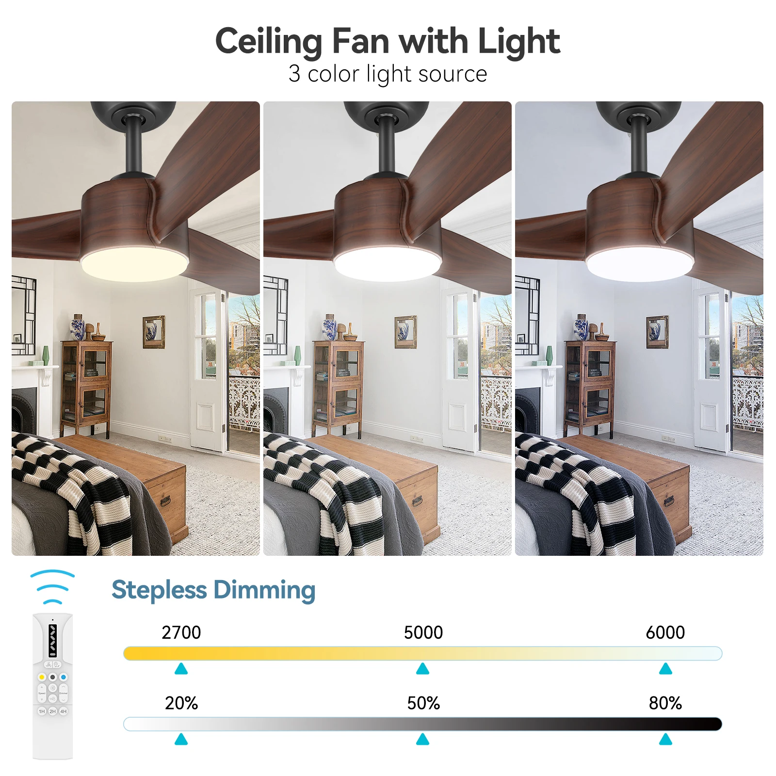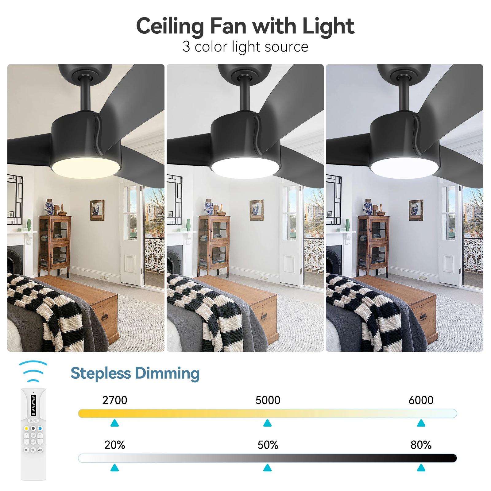 —Adjustable ceiling fan with 7 speeds – the remote control for the ceiling fan band has 7 different speed settings, including 6 fan speeds and 1 natural wind mode. The natural wind mode automatically switches between speeds 1 and 6, perfect for sleeping at night. You can also choose the ideal airflow depending on the season or preference.