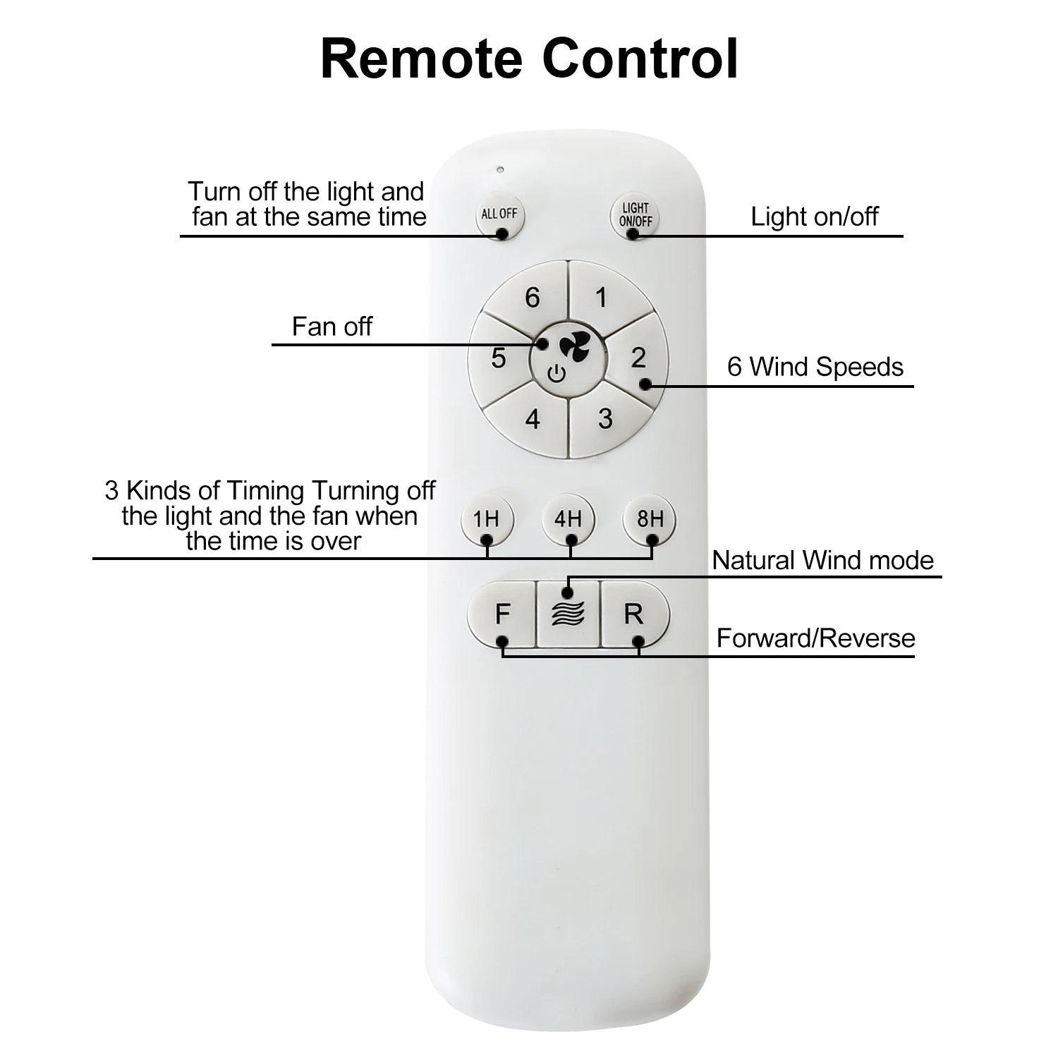 • Multi-function remote control: The main configuration of the remote control: 1/4/8h timing function, natural wind function, one-key reverse function, six-speed adjustment function, etc. The light and fan switches are separated. Both the instructions and installation video provide detailed steps for ceiling fan installation.