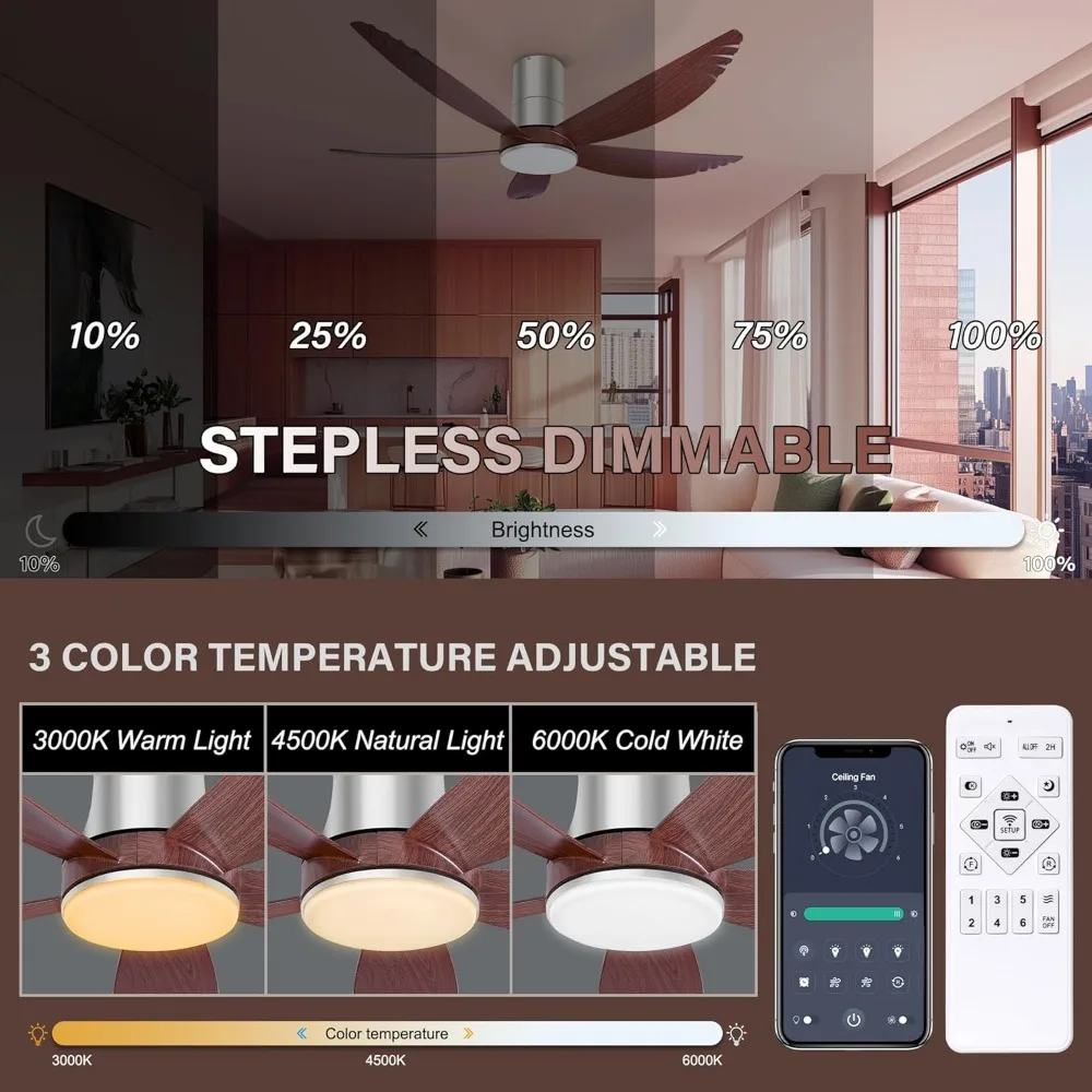 Three Color Temperature And Dimmable: Ceiling fan with remote control has three color temperature settings and can adjust the brightness, meet your different lighting requirements in your life. High-quality dimmable LED light and acrylic lampshade offering a soft and inviting glow, non-blinding.