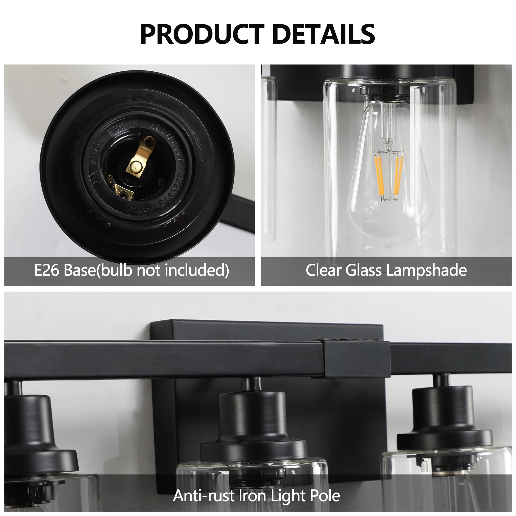 Premium Material:Our bathroom light fixture is made of high quality metal and glass, compatible with incandescent, LED, CFL and other bulbs of E26 standard medium base .Maximum power 60W, (Bulbs NOT Included).