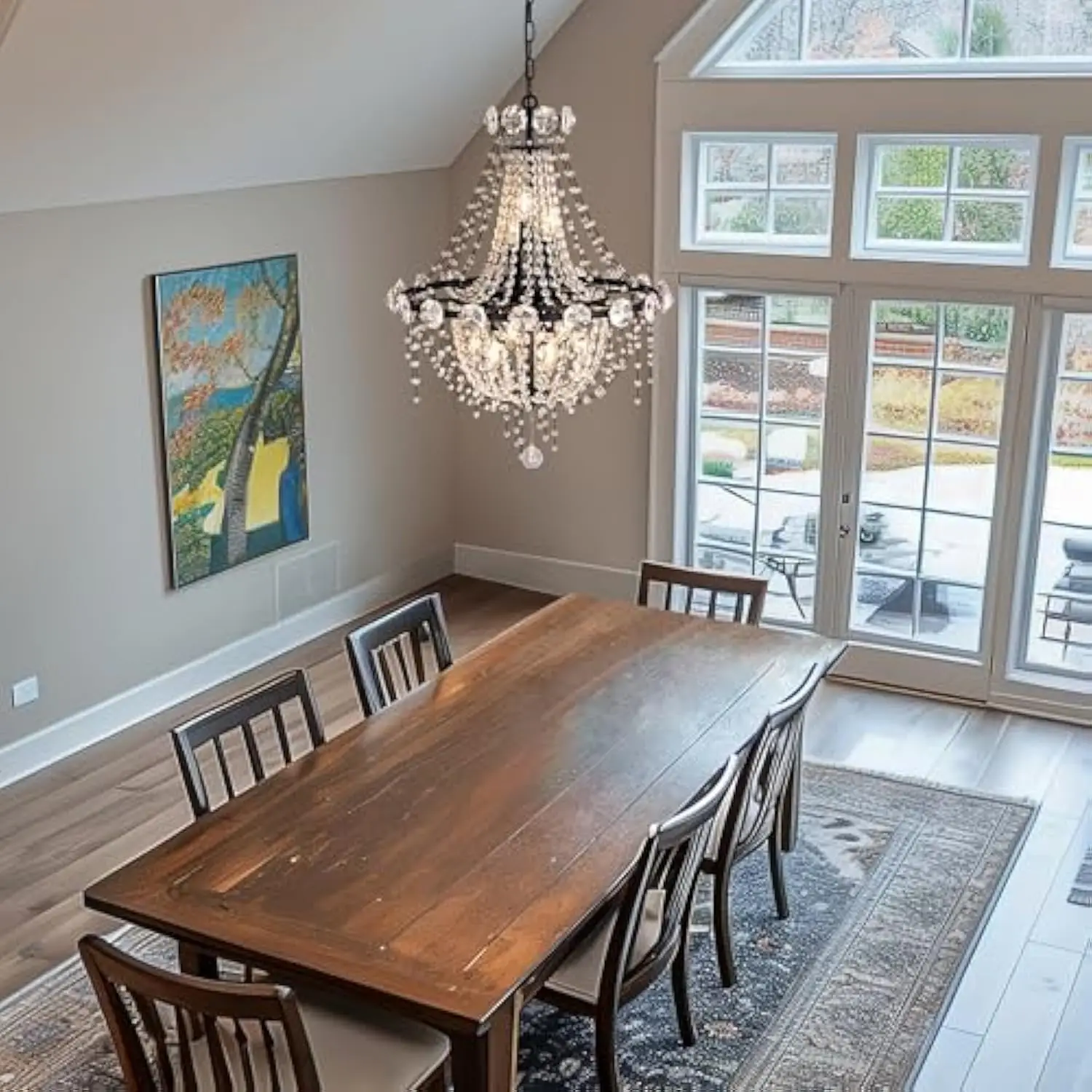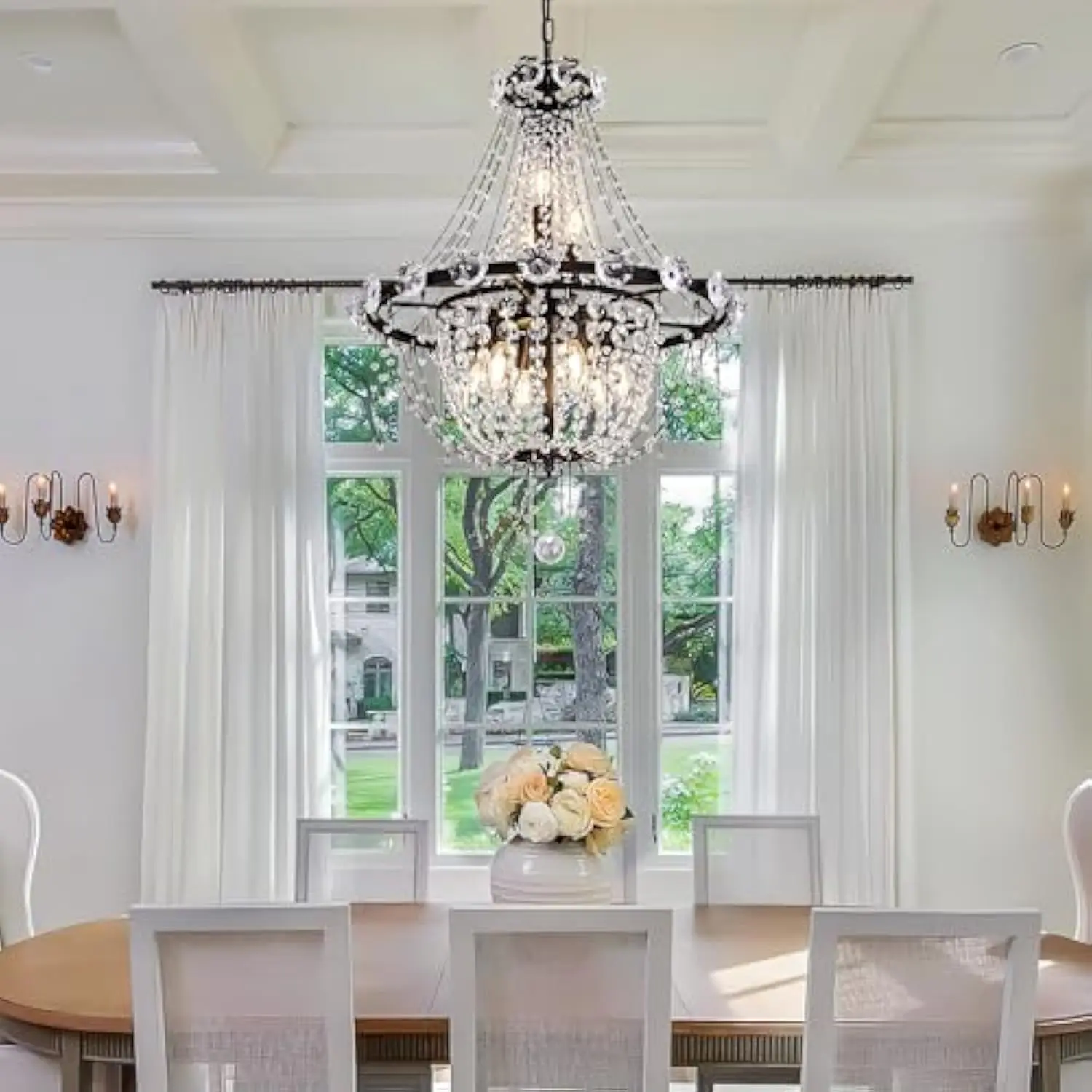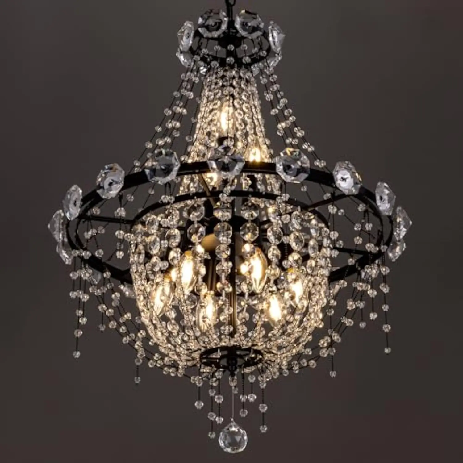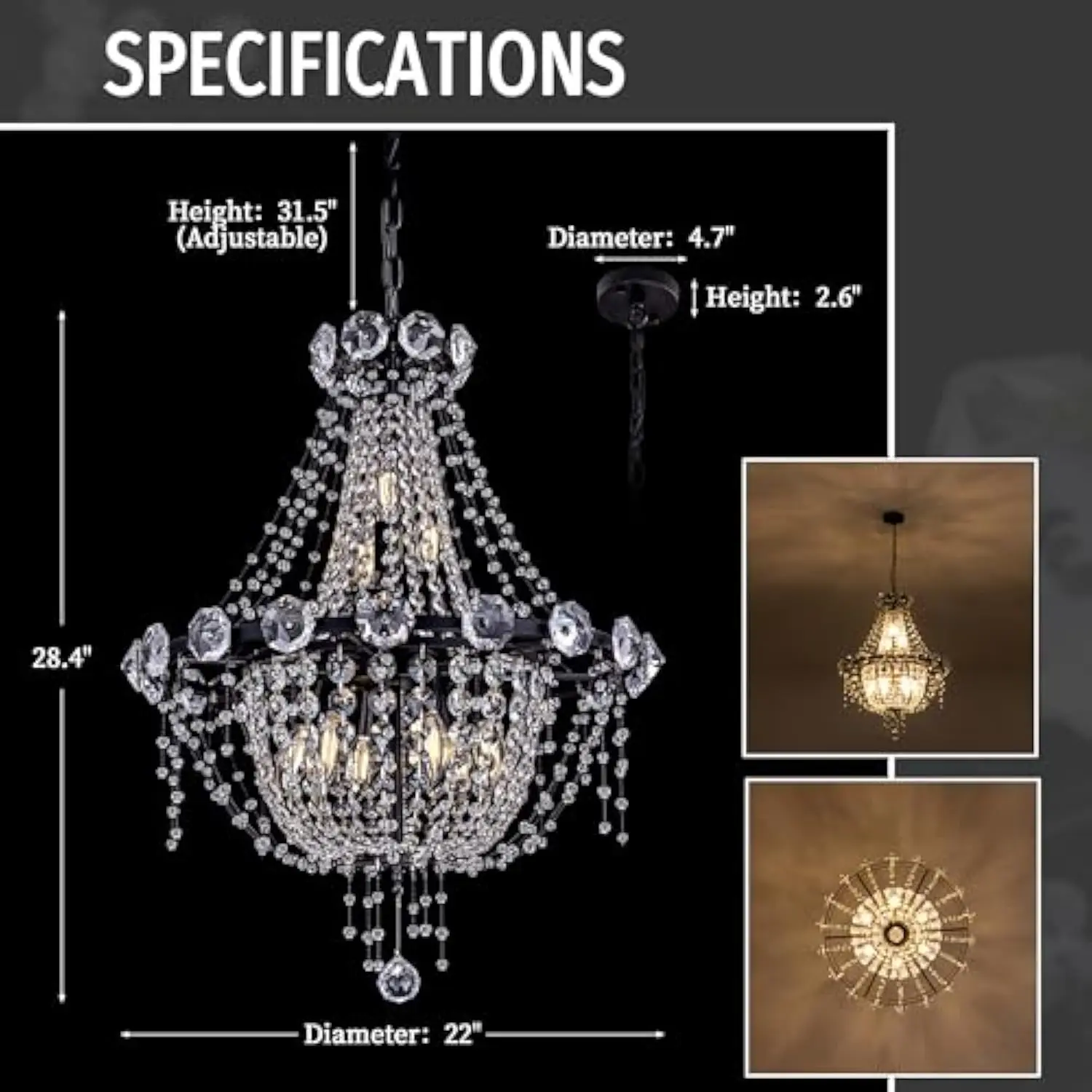 Luxury Crystal Chandeliers: The classic styling, timeless design, gorgeous looks, the french empire chandelier puts a twist on traditional and adorn your space like jewelry for your room Medium Size Gothic Chandelier: The dimension of this unique crystal pendant light is D 22″ x H 28.4″. The hanging chain height is from 2″-31.5″ adjustable. Medium black chandelier can fit perfectly into many home spaces Recommended Bulbs: Chandelier required E12 X 9 Bulbs (Max 60 Watt per), the crystal empire chandelier is compatible with LED/CFL/incandescent etc. It is dimmable with a compatible dimmer switch and dimmable bulbs (Bulbs and switch are not included) Wide Application: Black Light Fixture has a traditional look and makes it ideal for dining table, living room, bedroom, foyers, cafes, restaurants, staircase and hall etc. More Details: Farmhouse Chandelier needs simple installation, the time you spend will be worth it; If the crystal is broken in transit, the crystal can be replaced for free