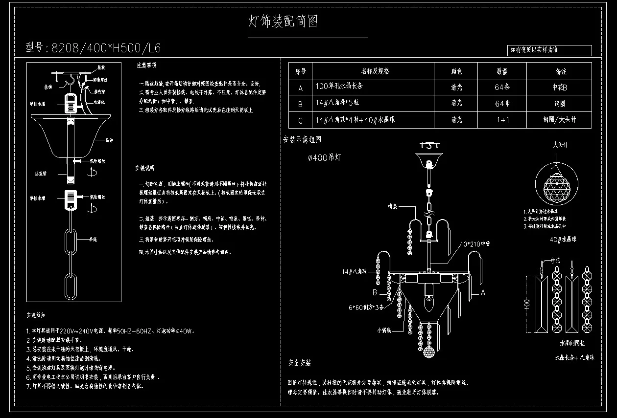 Please make sure the power is cut off before installation and when you clean the light. To ensure your safety, we recommend that two people install this chandelier together. The surface of the lamp plate and the electric wire should avoid scratching when mounting, and electric insulation gloves( not included) must be worn when installing. Please install it by someone with an electrical license if necessary.