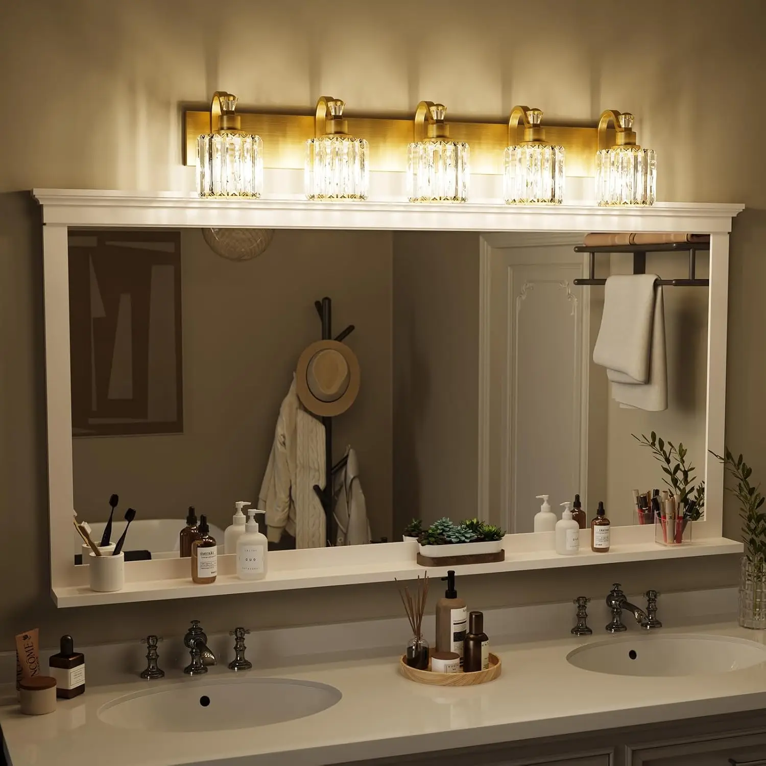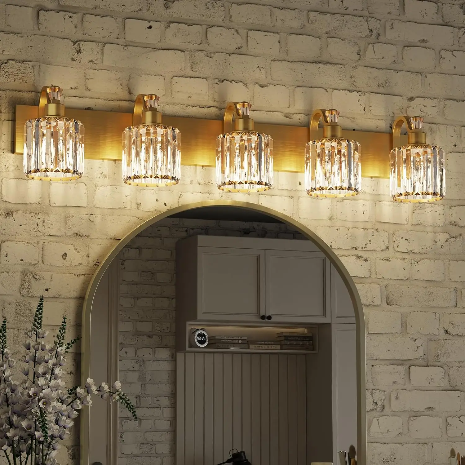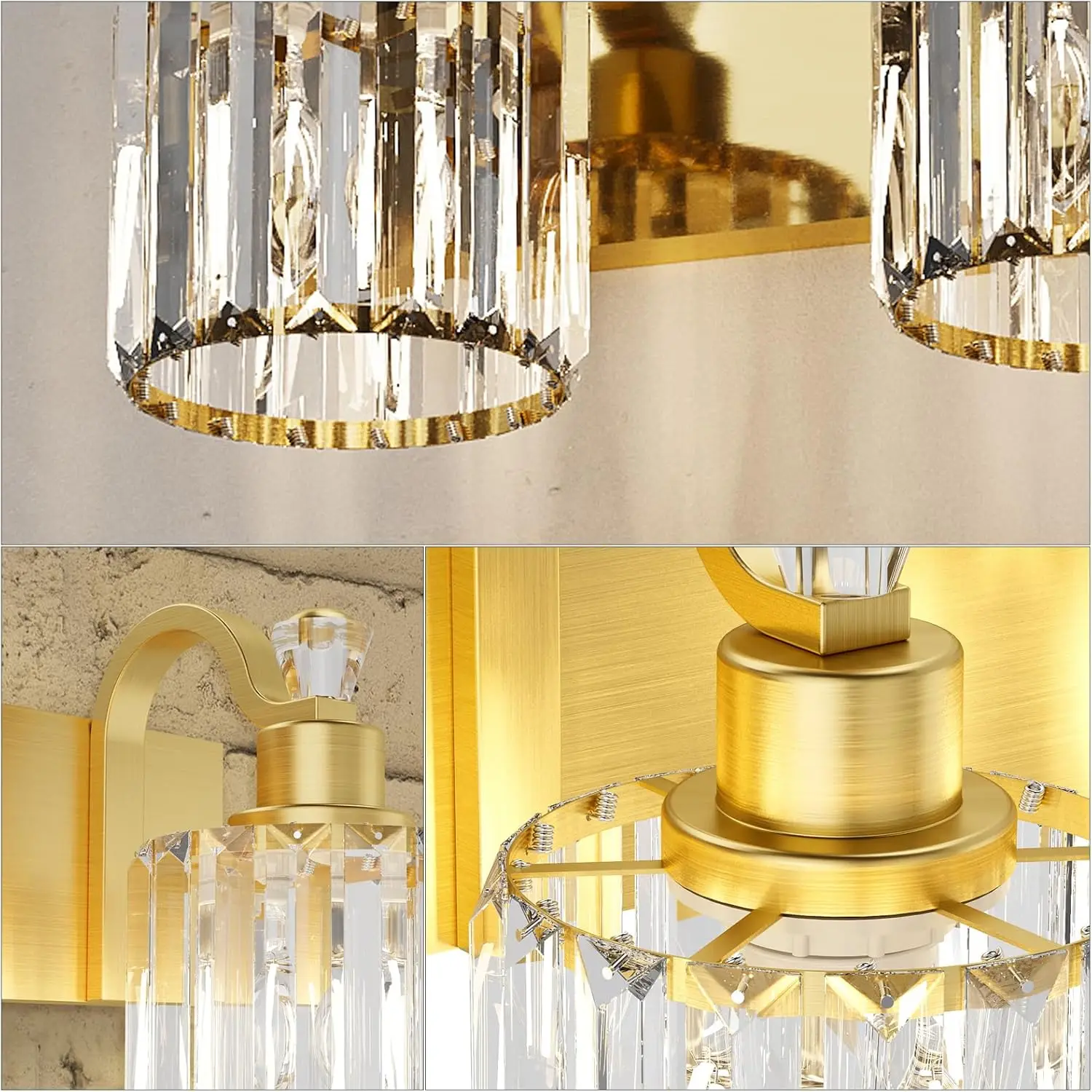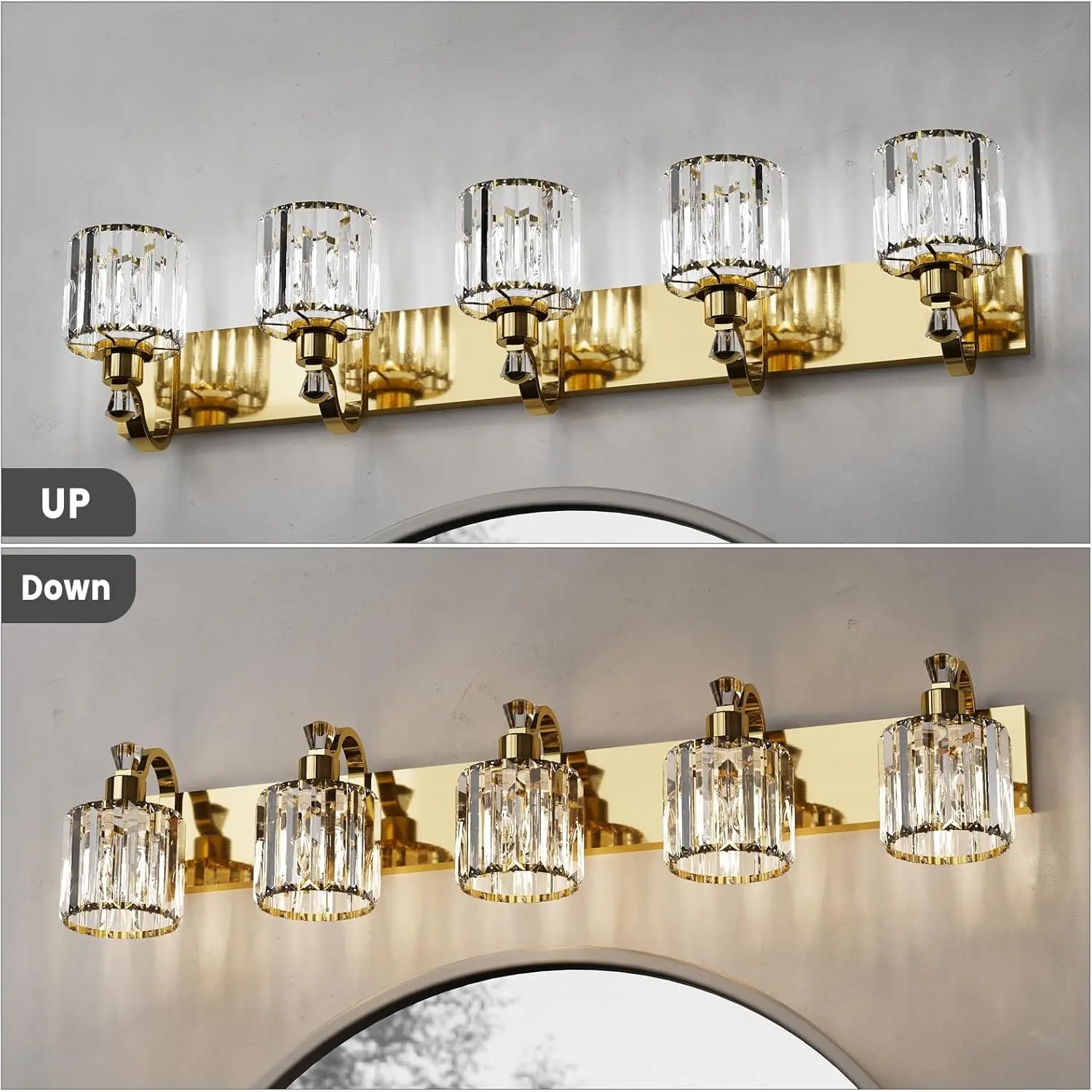 【High-Quality Modern Design】This 3/4/5/6-light bathroom vanity light features high-quality mirrored gold finish and premium transparent K9 crystal lampshades, making it an excellent decoration for your home. It is corrosion-resistant, moisture-proof, and durable. Additionally, it can create beautiful lighting effects, with a simple yet luxurious design that showcases your taste in bathroom vanity lighting.