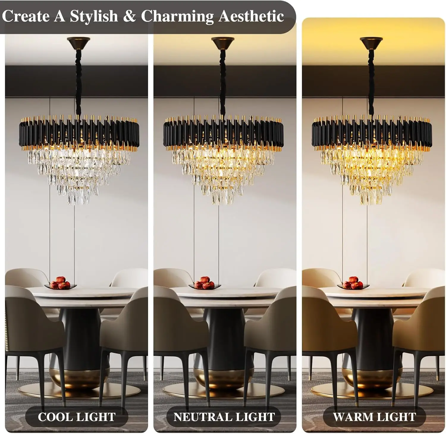 Crystal chandelier for dining room, easy to install: The black and gold chandelier is easy to install, instruction manual included, will only cost you some time to assemble the crystals, but it is certainly amazing when you turn it on. When you turn on the light, the crystal chandeliers for the dining room will reflect through the crystal, giving your home a romantic, fancy and shiny atmosphere.