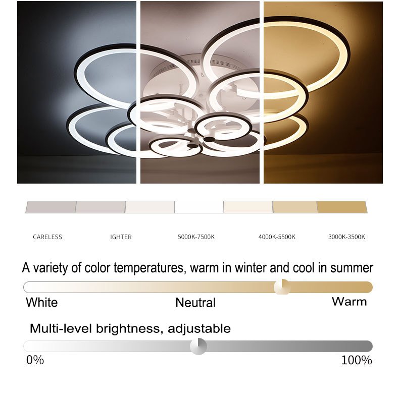 The body of the ceiling lamp is creatively designed with four composed circulars with fine workmanship, bringing more brilliance to your life and highlighting your taste. This ceiling lamp is infinitely dimmable with three adjustable colors including white light, warm light, and neutral light, you can adjust it according to your own needs. This ceiling lamp is perfect for living rooms, balconies, bars, cafes, clothing stores, aisles, etc. It is suitable for an area of about 86.11ft²-161.46ft².