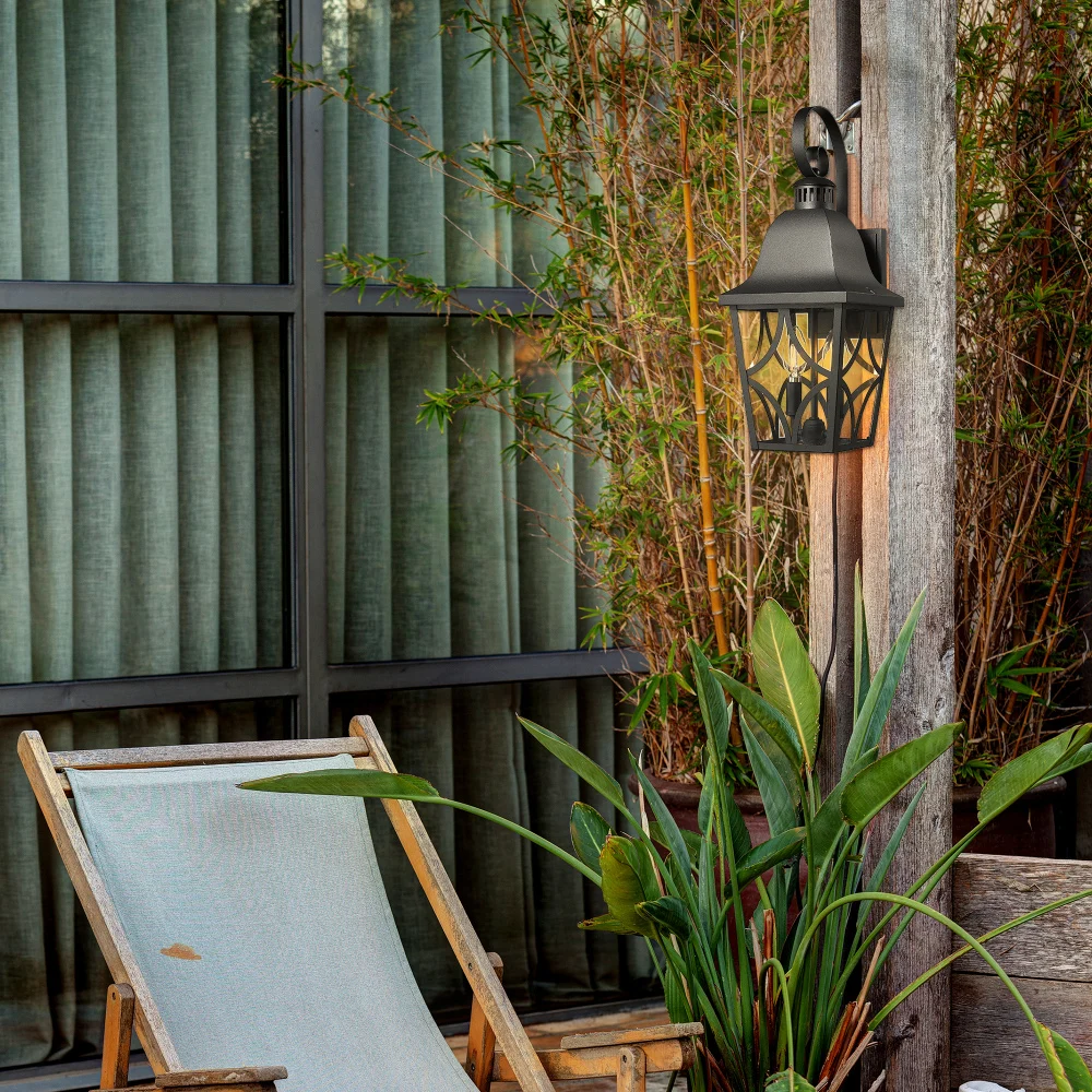 • Classic & Elegant Design: Our outdoor wall lights feature a charming structure with a black matte line frame that not only adds a touch of elegance but also serves to support and protect the inner shade.