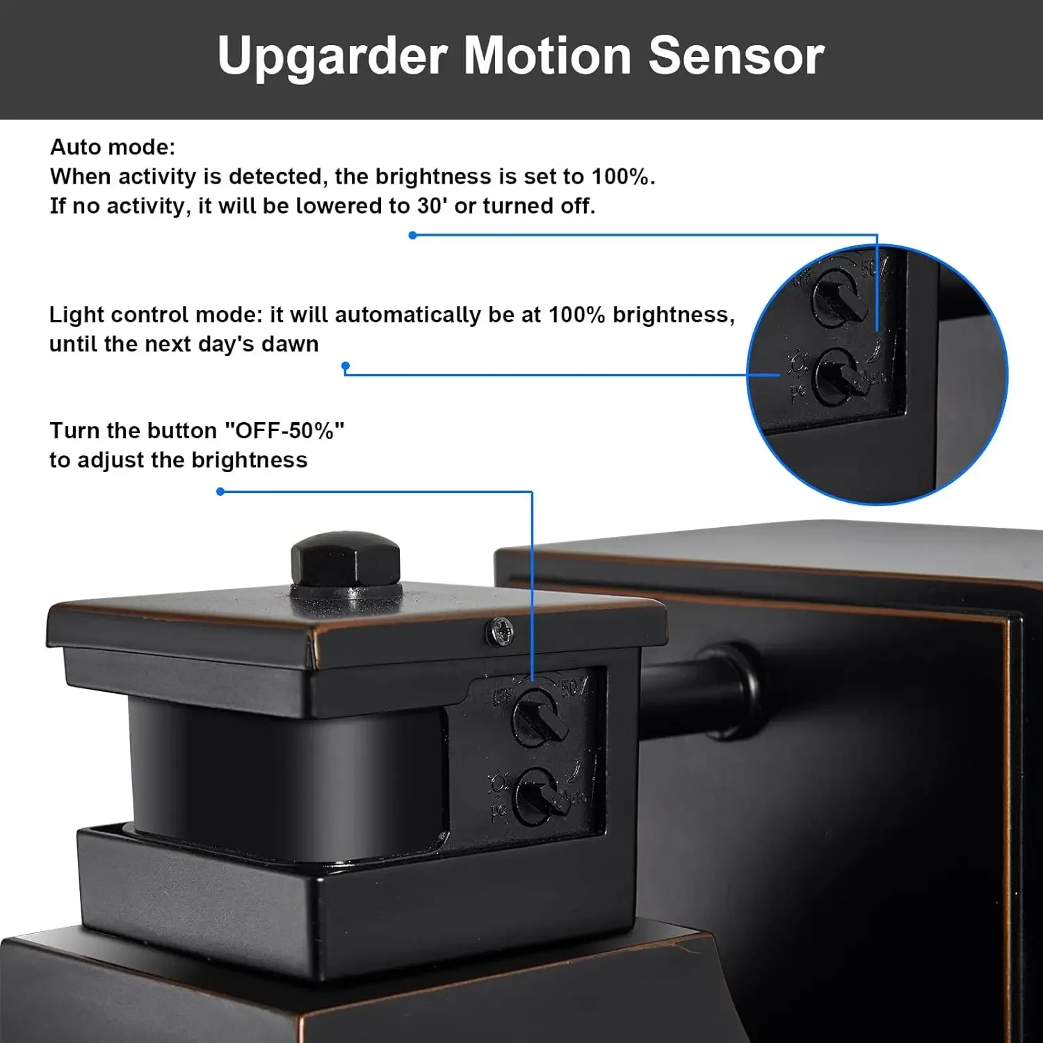 - Upgraded Motion Sensor Mode: By setting the button to “Auto,” the motion sensor mode activates. When human activity is detected, the red light blinks 5 times and switches to 100% high brightness. After 120 seconds of no human activity, it switches to low brightness. (Note: Brightness adjustment is only available in motion sensing mode.)