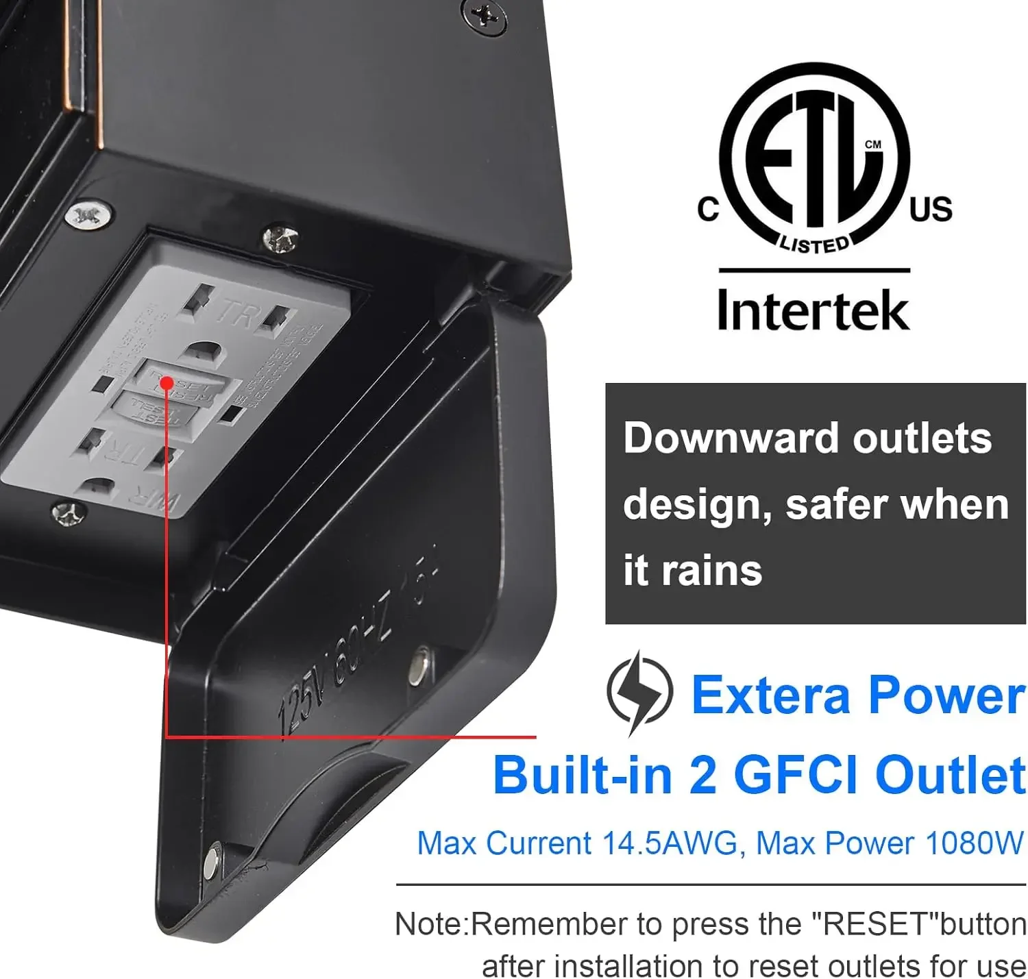 - Built-in GFCI Outlet: Enhance outdoor convenience with 2 GFCI Outlets offering secure power access. Safeguard against surges, short circuits, and faults. Versatile porch light sockets suit party decor, gardening and power tools, security cameras, and more. Unlike competitors, it features rain-protected downward-facing GFCI outlets. Max power 14.5AWG, max load 1080W. Simplify outdoor power while ensuring safety.