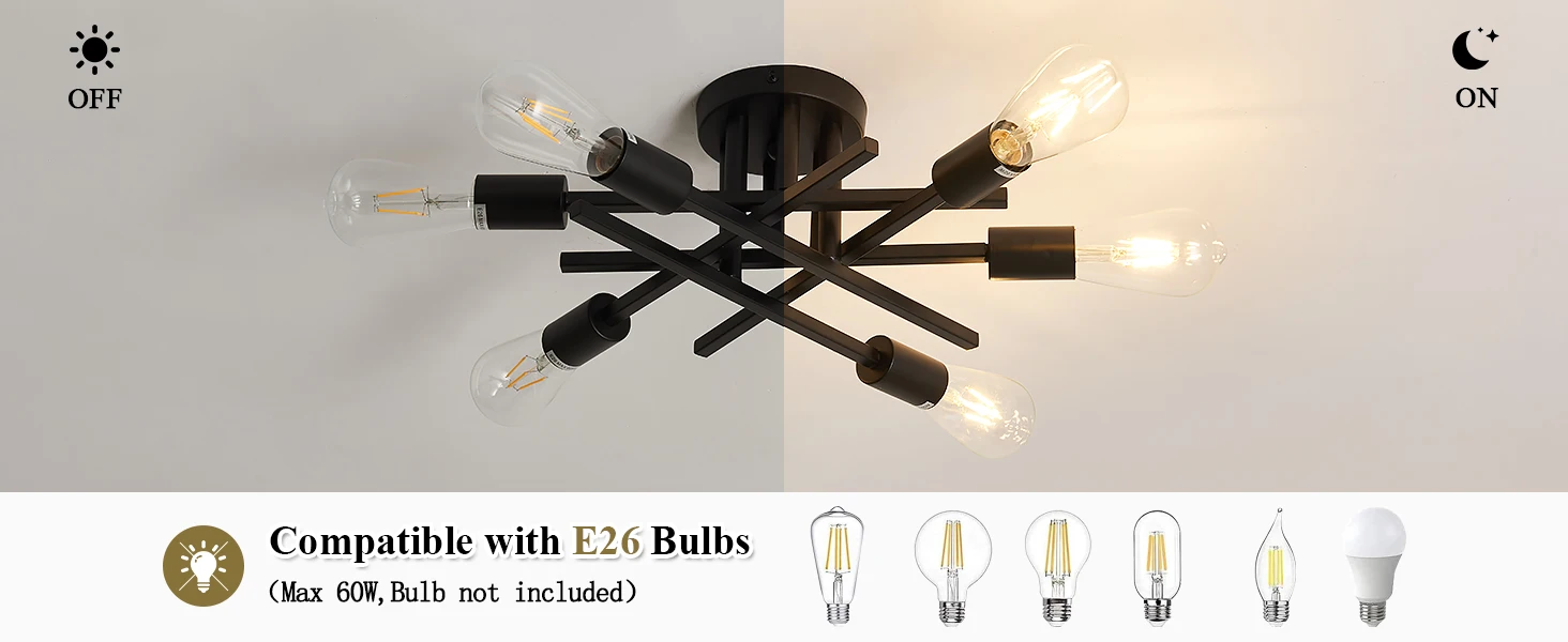E26 Bulb Base(Bulb Not Included)Compatible with LED ,Edison ,incandescent , CFL and halogen bulbs,up to 60 watts maximum.