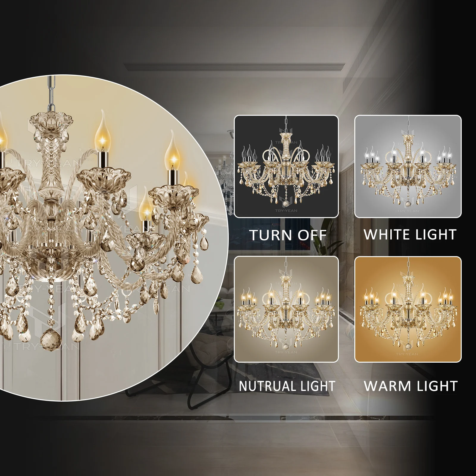 When you open the crystal chandelier, you could adjust the lighting mode, including white light, neutral light and warm light.