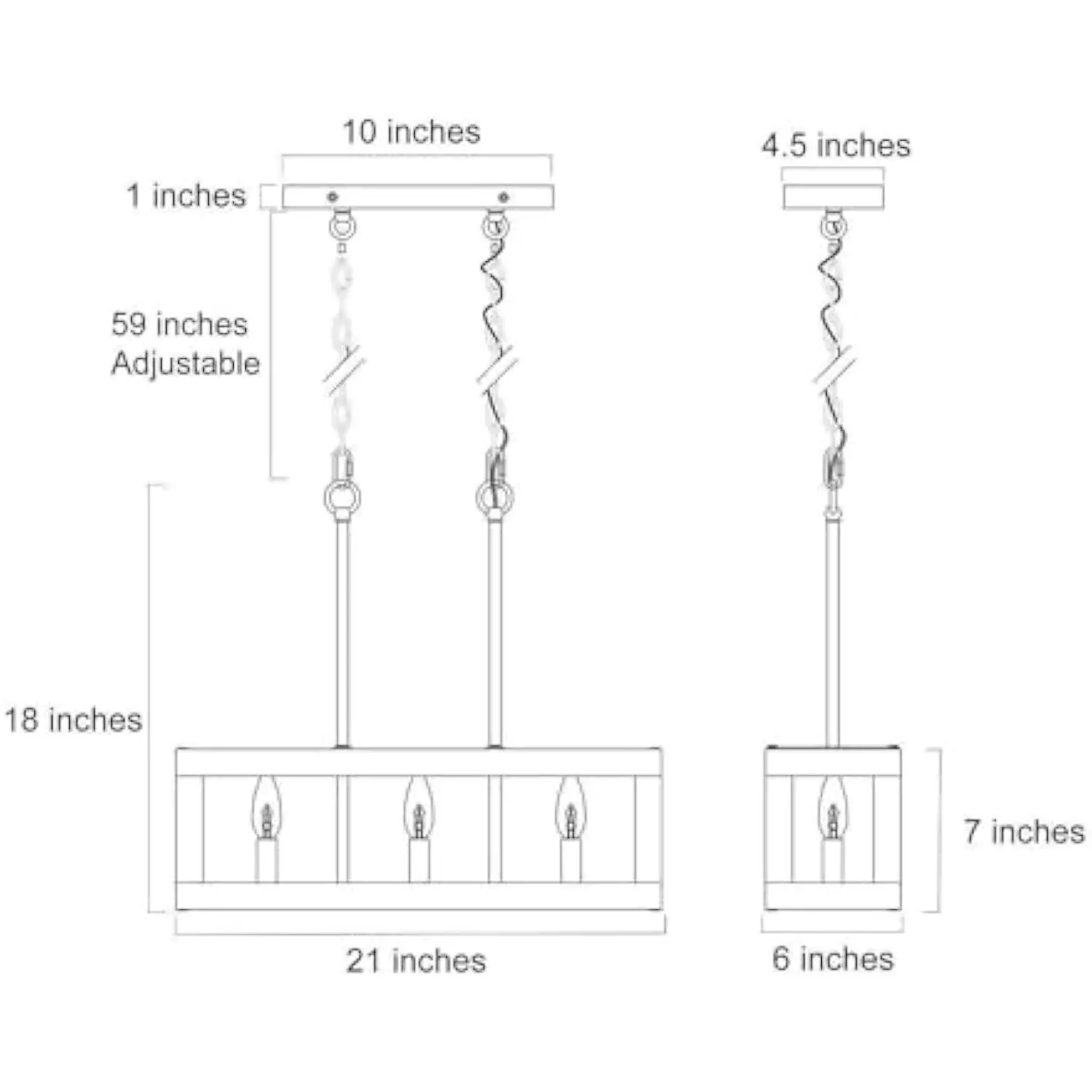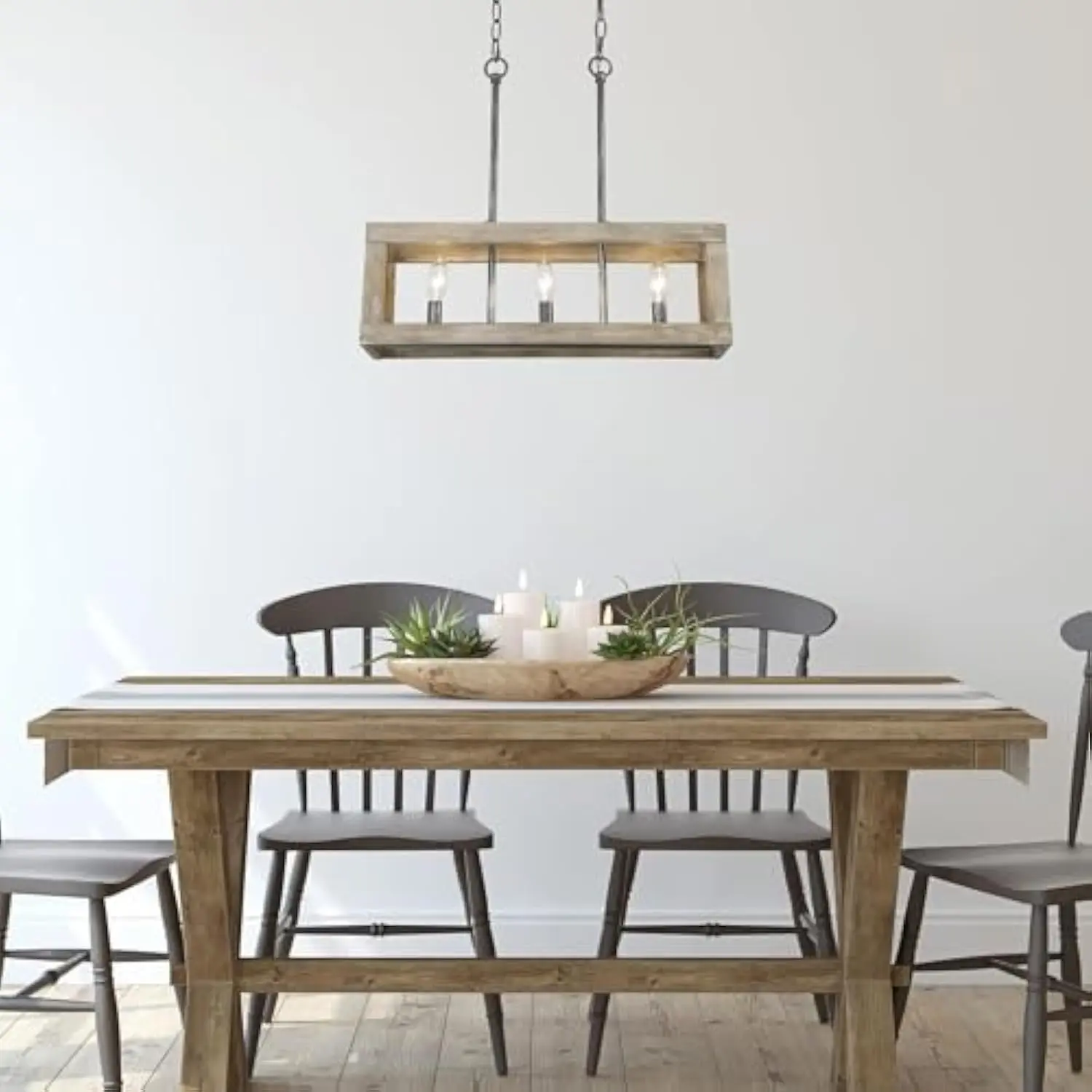 Bring a touch of classic barn-like charm to your dining rooms and kitchen island with the 3-light rustic dining room chandelier. Crafted with a solid wood open rectangular frame and metal light bases, it casts a warm country glow. The dimensions of the rectangular frame are 21″ L x 5.8″ W x 18″ H, with a canopy measuring 10″ L x 1” H. The adjustable chains are 2 x 59″, allowing you to customize the height from 20″ to 78″ to suit most ceiling types. For easy installation, the wood farmhouse chandelier includes all necessary mounting hardware and clear instructions. With some basic electrical knowledge, you can confidently complete the installation on your own. Experience full dimmability with this wood chandelier light fixture when used with dimmable bulbs and a compatible dimmer switch (both not included). Requires 3 * E12 base Max 40W of each bulbs. The frame emits a soft and warm light, creating a comfortable and inviting atmosphere in your dining room and kitchen. UL listed for dry locations. Backed by a 2-year warranty and 24-hour customer support, any concerns can be addressed promptly by contacting us. Product Dimensions : 21.3 x 5.9 x 7.1 inches; 7.7 Pounds